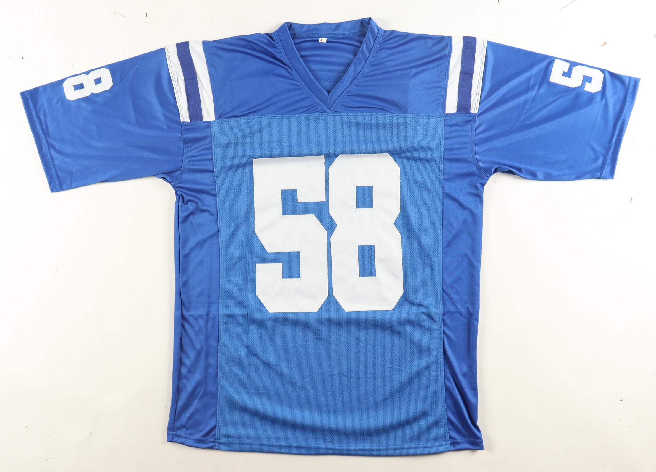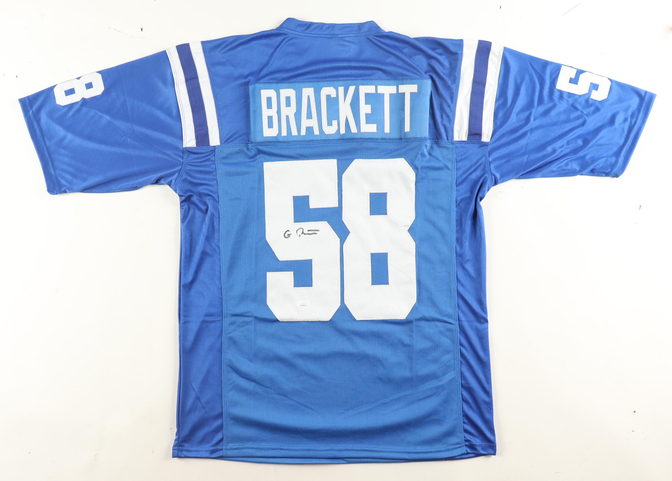 Custom jersey with everything sewn on, size XL. Hand-signed by Gary Brackett.