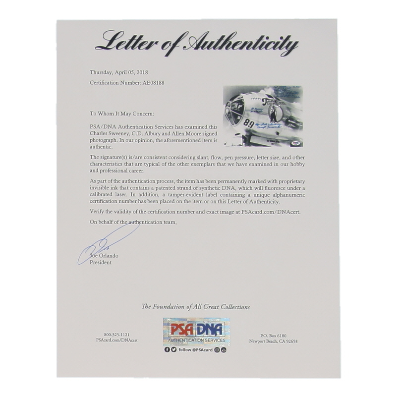 Presented is a hand-signed 8x10 photograph of the famed Boeing B-29 Superfortress “The Great Artiste,” personally autographed by Major General Charles W. Sweeney (1919–2004), Captain Charles Donald “C.D.” Albury (1920–2009), and Technical Sergeant Allen L. Moore (1920–2010). The photograph has been authenticated by PSA/DNA and is accompanied by their Letter of Authenticity, ensuring both verification and long-term preservation.
