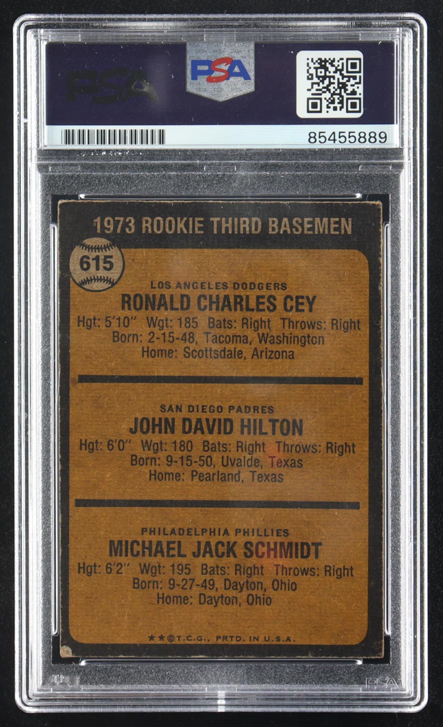 Mike Schmidt Signed 1973 Topps Rookie Third Basemen Ron Cey/John Hilton RC/Mike Schmidt RC (PSA)