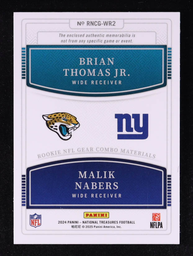 Brian Thomas Jr. / Malik Nabers 2024 Panini National Treasures Rookie NFL Gear Combo Materials #6 #25/49 RC