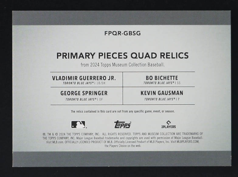 Vladimir Guerrero Jr. / Bo Bichette / George Springer / Kevin Gausman 2024 Topps Museum Collection Primary Pieces Four Player Quad Relics Copper #FPQR-GBSG