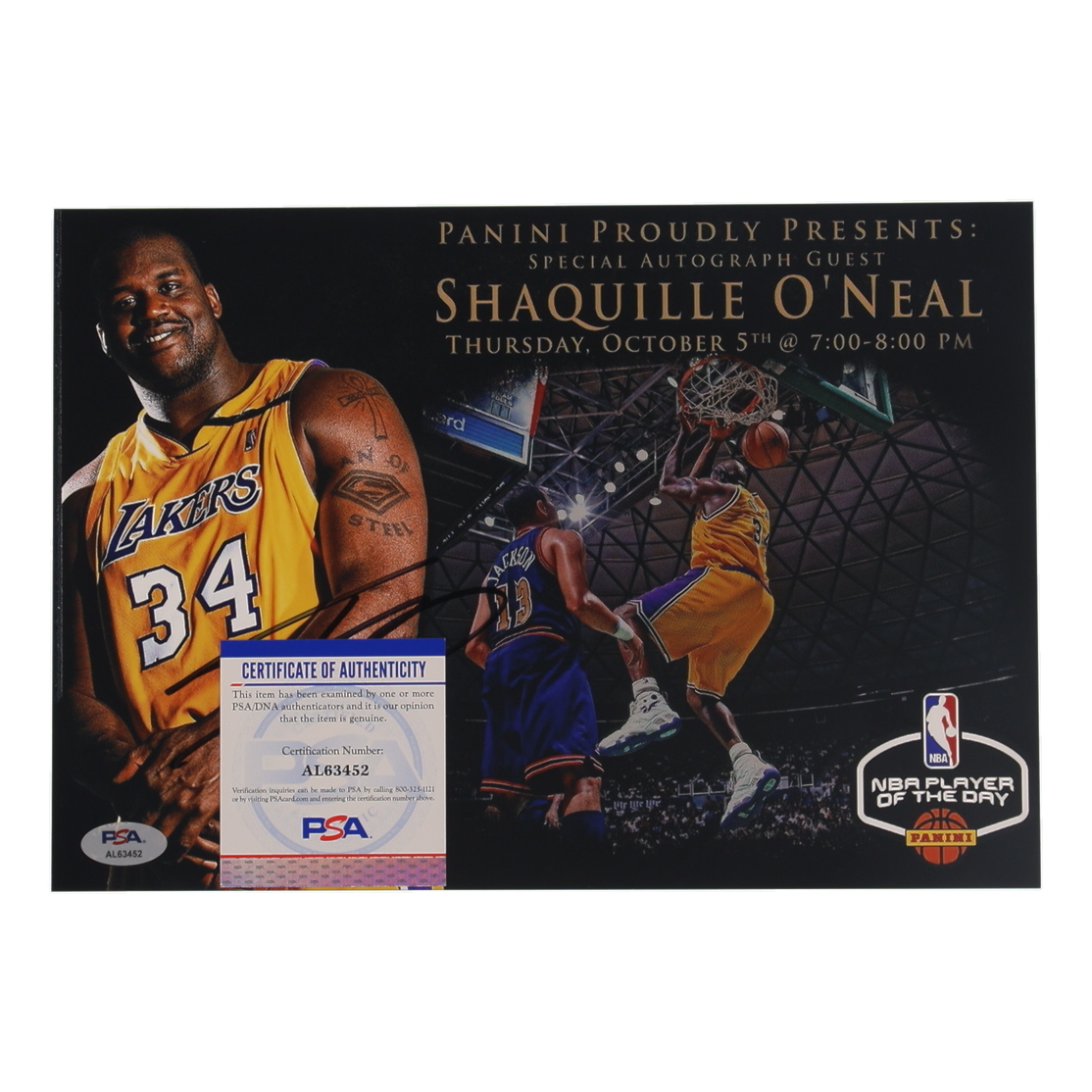 Photo measures 8” x 11.5” in size and has been hand-signed by Shaquille O'Neal (Los Angeles Lakers).