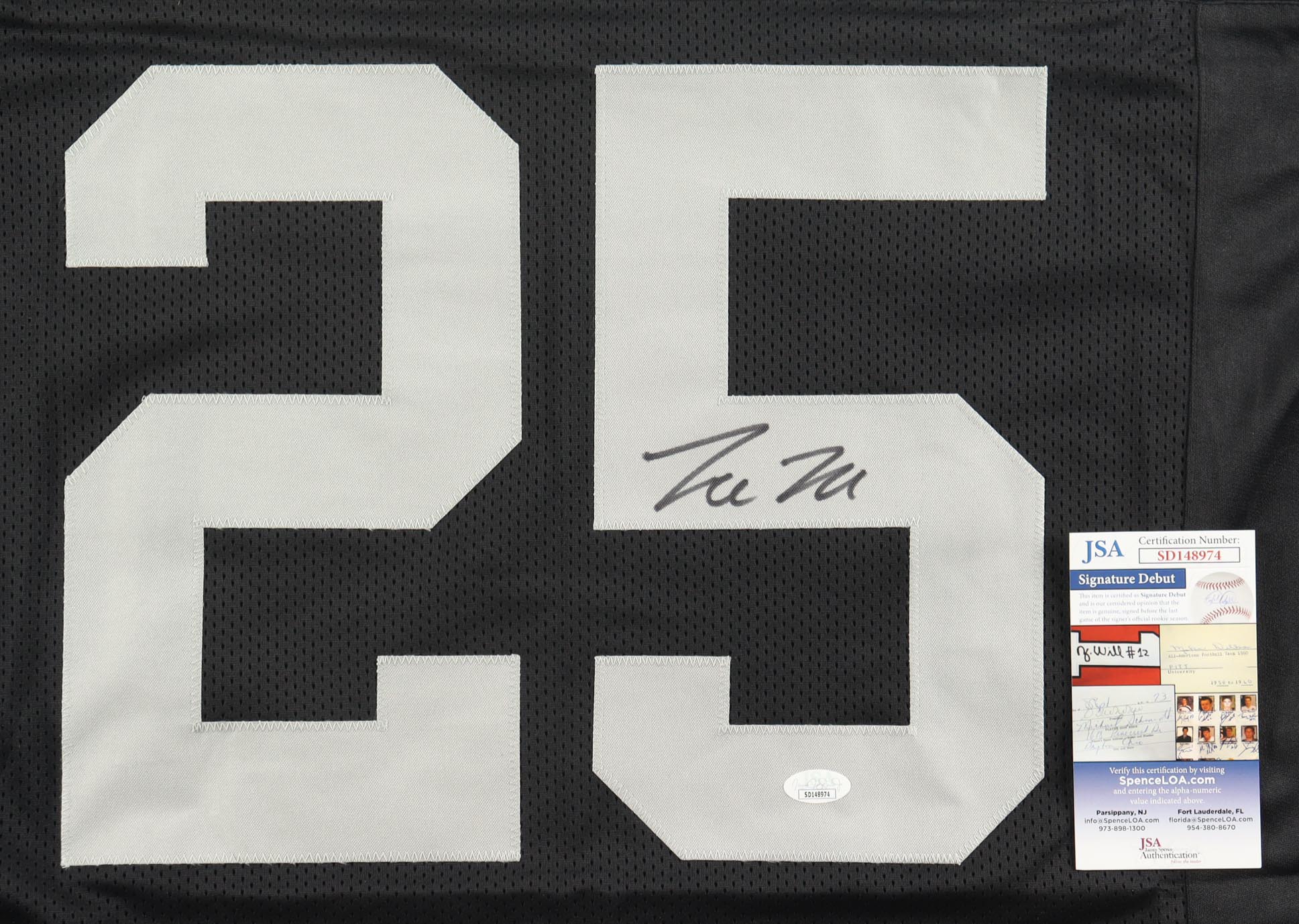 The autograph(s) includes an official James Spence Authentication (JSA) "Signature Debut" hologram and COA. "Signature Debut" is the autographed memorabilia equivalent to a rookie card. The JSA definition of a "Signature Debut" is as follows: "Any item that is autographed and received by JSA prior to the last game of the signer's official rookie season.