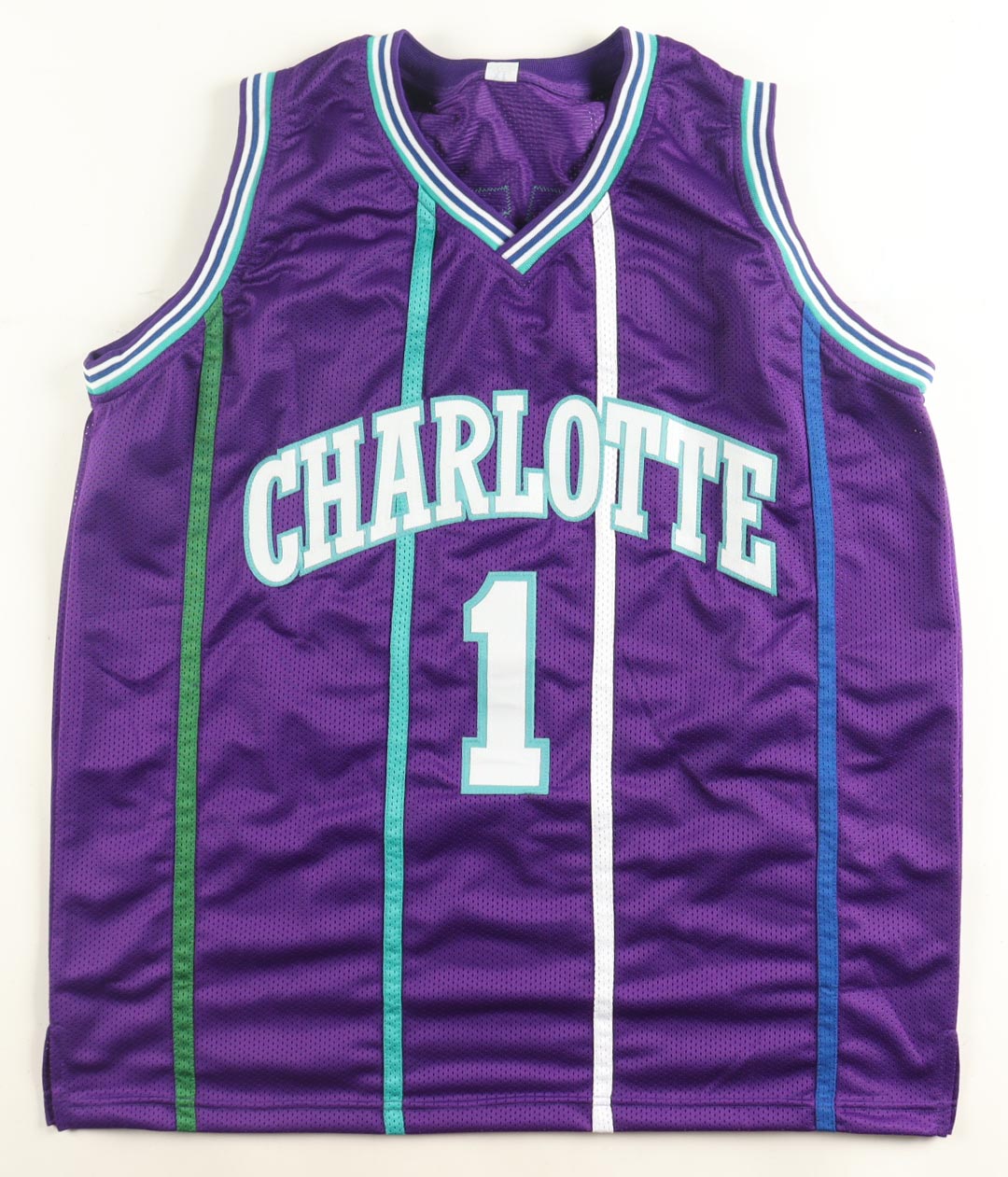 Custom jersey with everything sewn on, size XL. Hand-signed by Muggsy Bogues.