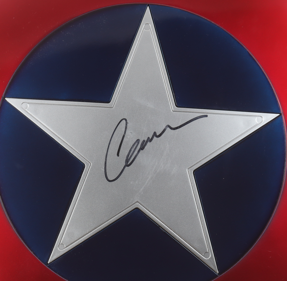 Full-size shield measures approximately 24" in diameter and is hand-signed by Chris Evans (Captain America). Please note, the signature is scuffed.