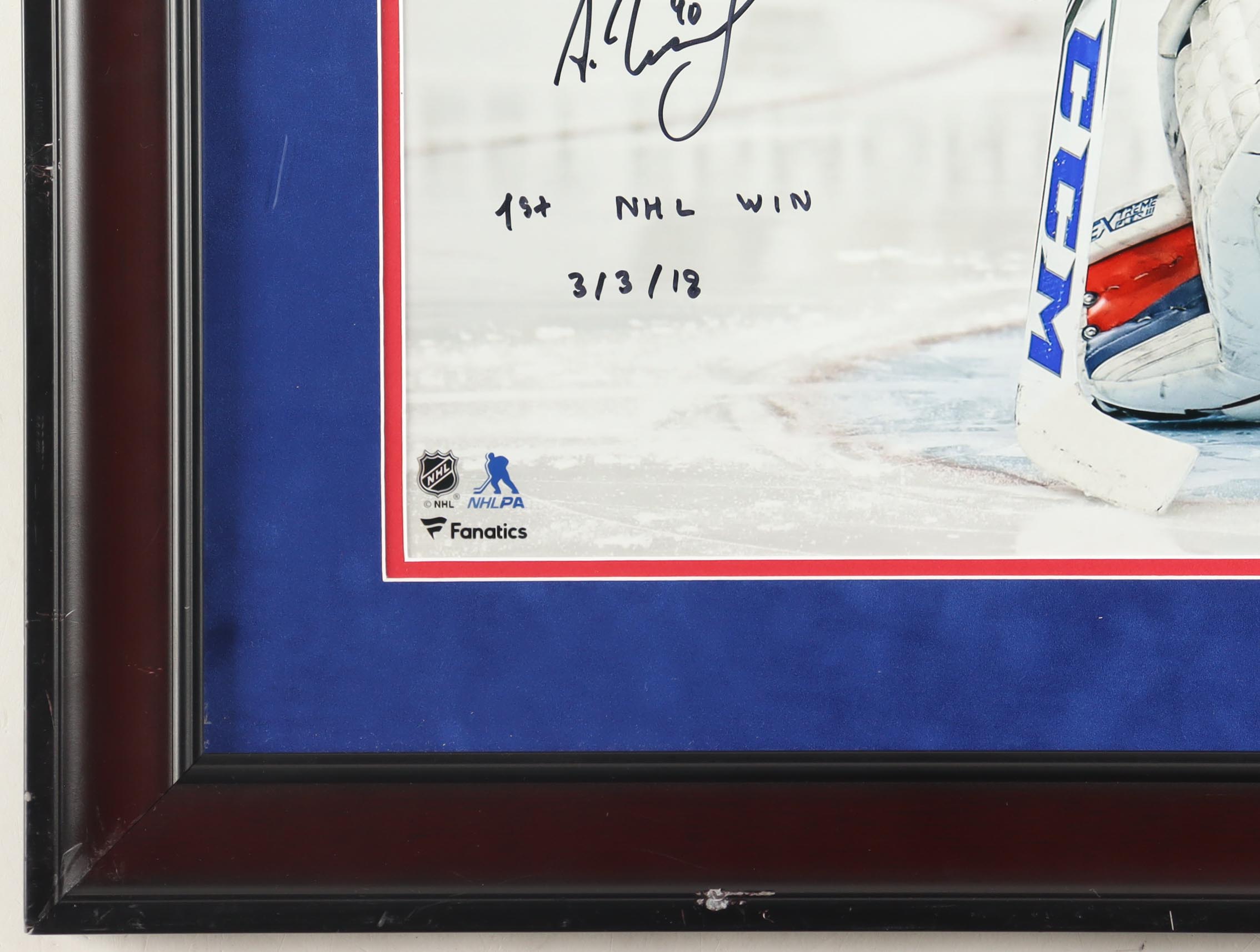 Custom frame measures approximately 22" x 26" in size. Hand-signed and inscribed by Alexandar Georgiev (New York Rangers). Please see photos for details regarding the item. Note that the frame shows signs of wear.