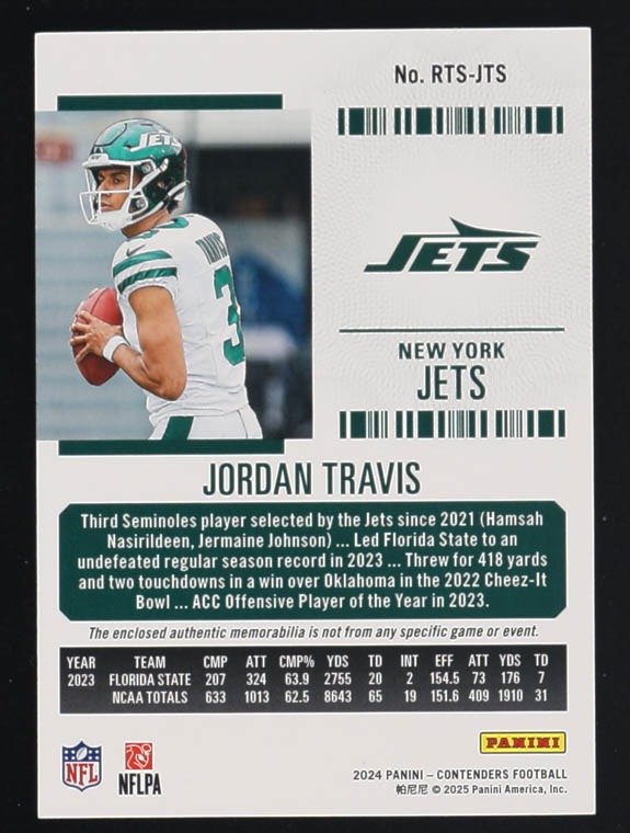 Jordan Travis 2024 Panini Contenders Rookie Ticket Swatches #RTS-JTS RC