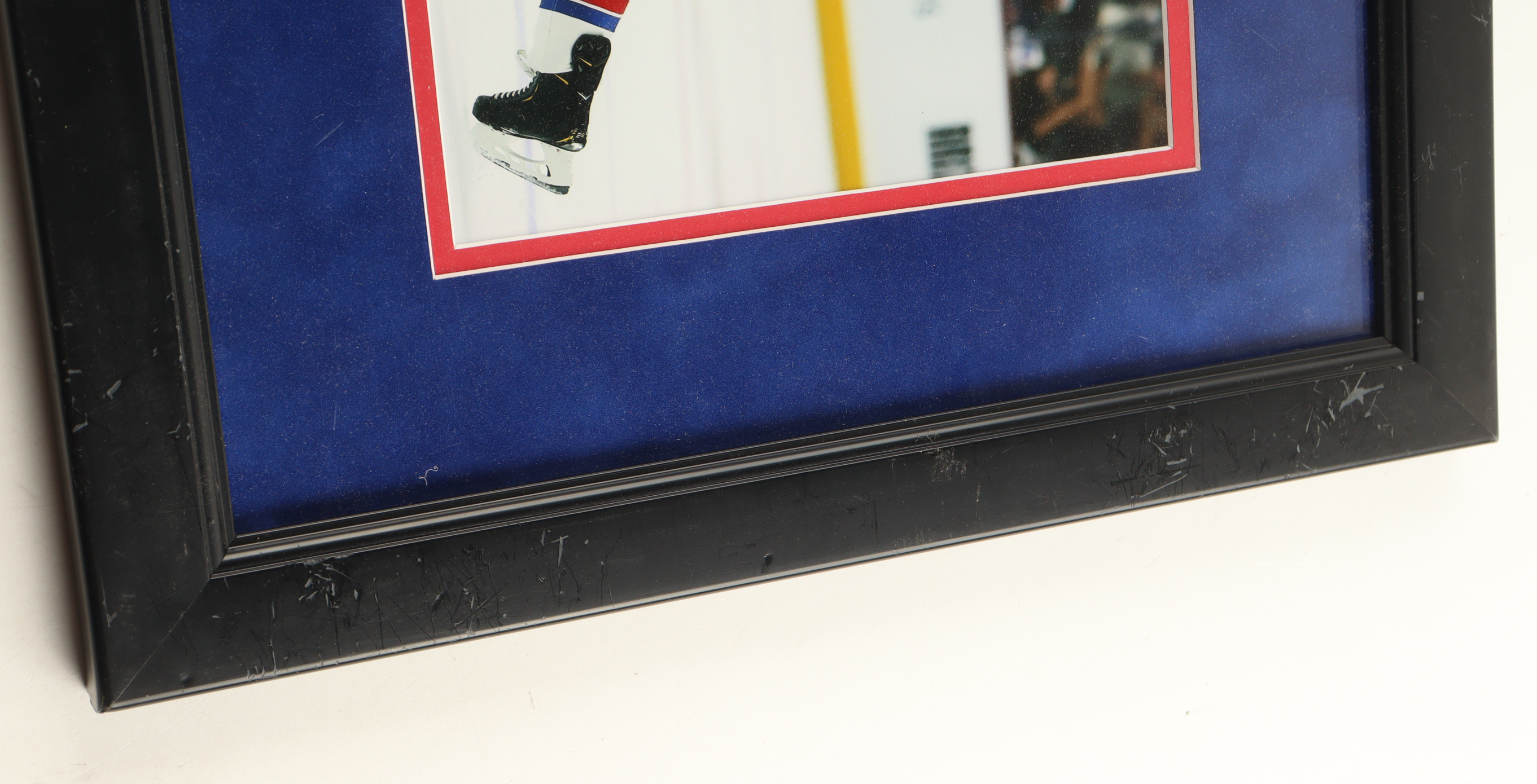 Custom frame measures approximately 15" x 17" in size. Hand-signed by Jacob Trouba (New York Rangers). Please see photos for details regarding the item. Note that the frame shows signs of wear.