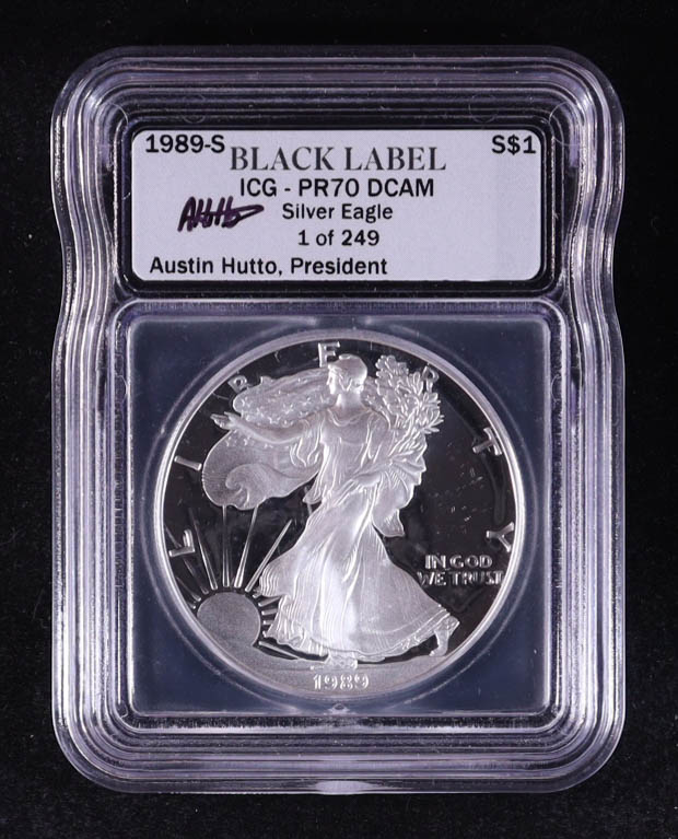 1989-S American Silver Eagle - 1oz Fine Silver Austin Hutto Signature Black Label LE #/249 (ICG PR70 DCAM)