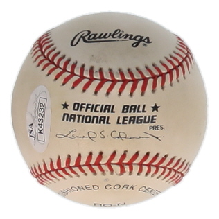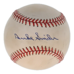Rawlings Official National League Baseball. Hand-signed by Duke Snider (D. 2011, Los Angeles Dodgers, HOF). Please note, the baseball is naturally toned and stained.