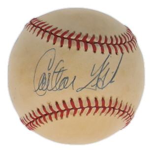 Rawlings Official American League Baseball. Hand-signed by Carlton Fisk (Chicago White Sox, HOF). Please note, baseball is stained and naturally toned.