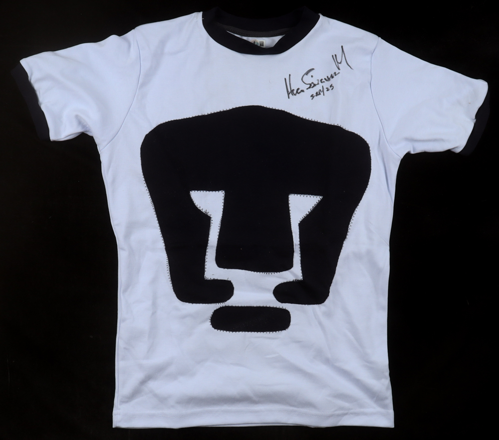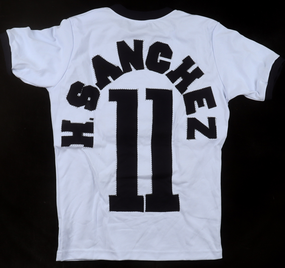 Custom jersey with everything sewn on, size XL. Hand-signed and inscribed by Hugo Sanchez.