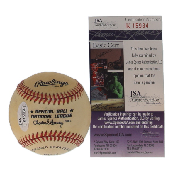Rawlings Official National League Baseball. Hand-signed by Robin Roberts (D. 2010, Philadelphia Phillies, HOF). Please note, the baseball is naturally toned and stained.