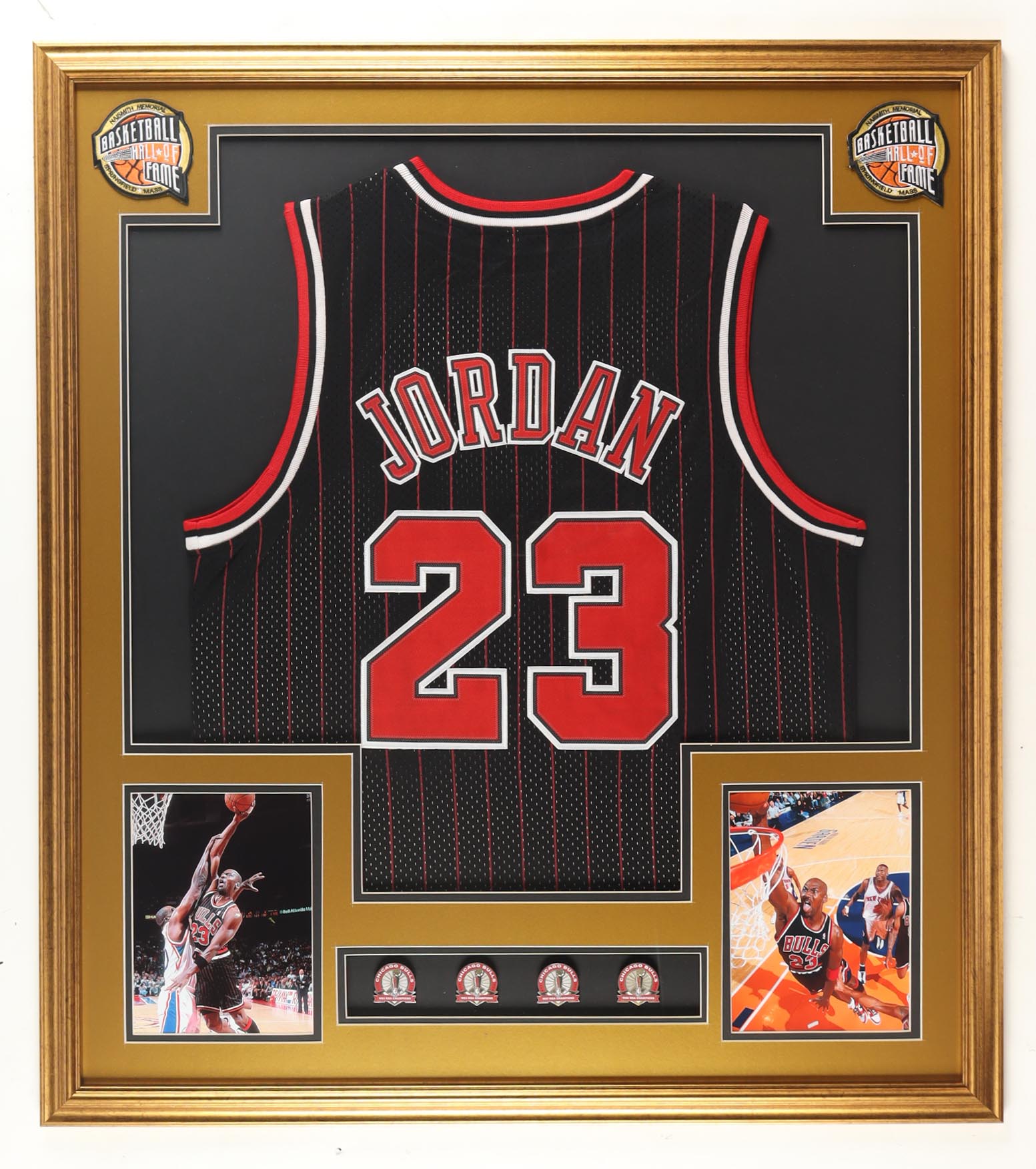 Custom frame measures approximately 33" x 37" in size and features an unsigned Michael Jordan (HOF) jersey. The display also includes (2) Photos and (4) Championship Pins. Please note, the display is unsigned.