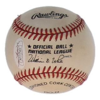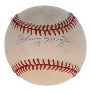 Rawlings Official National League Baseball. Hand-signed by Johnny Mize (D. 1993, St. Louis Cardinals, HOF). Please note, there is natural toning and staining throughout the baseball.
