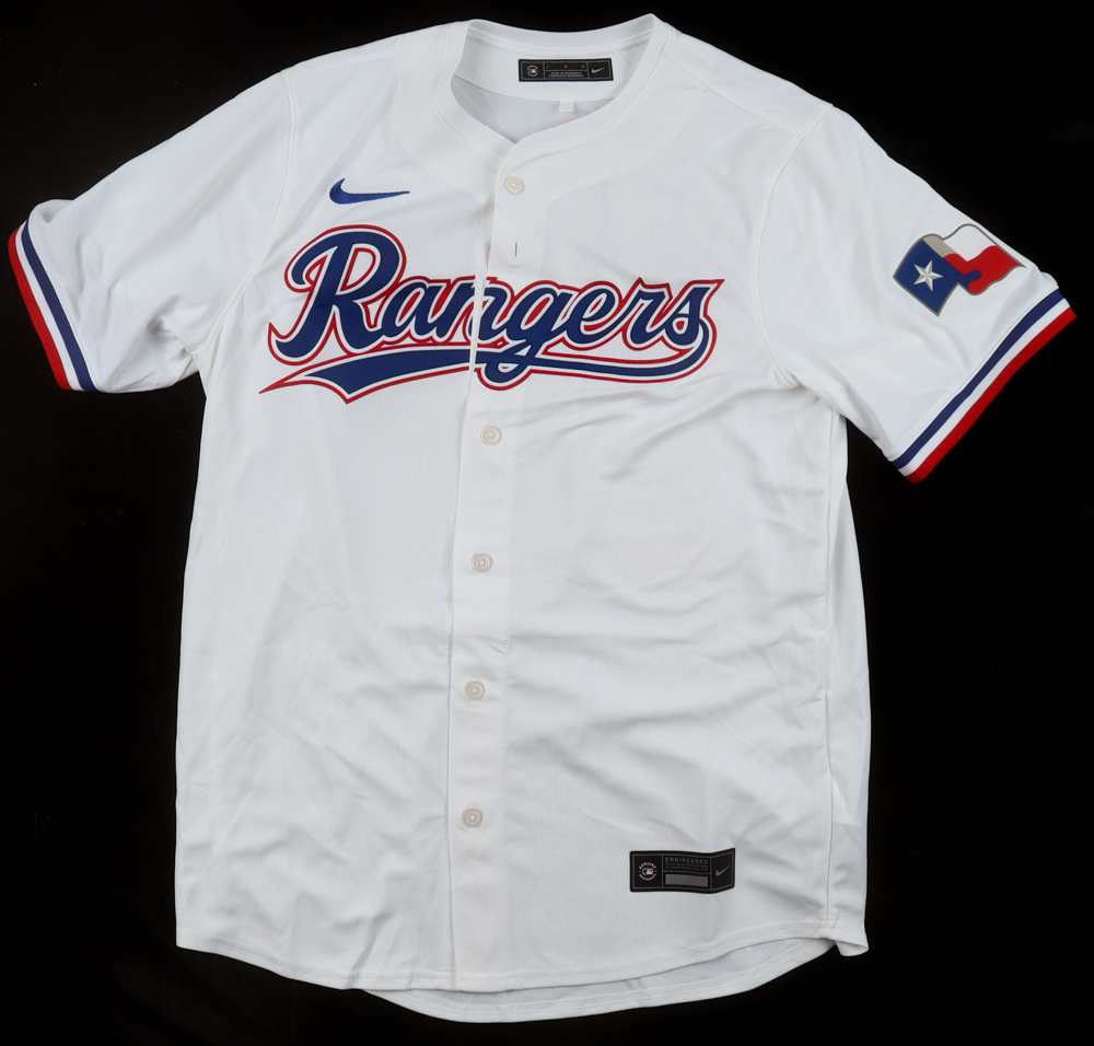 Nike jersey with everything sewn and pressed on, size L. Hand-signed by Adrian Beltre (Texas Rangers).