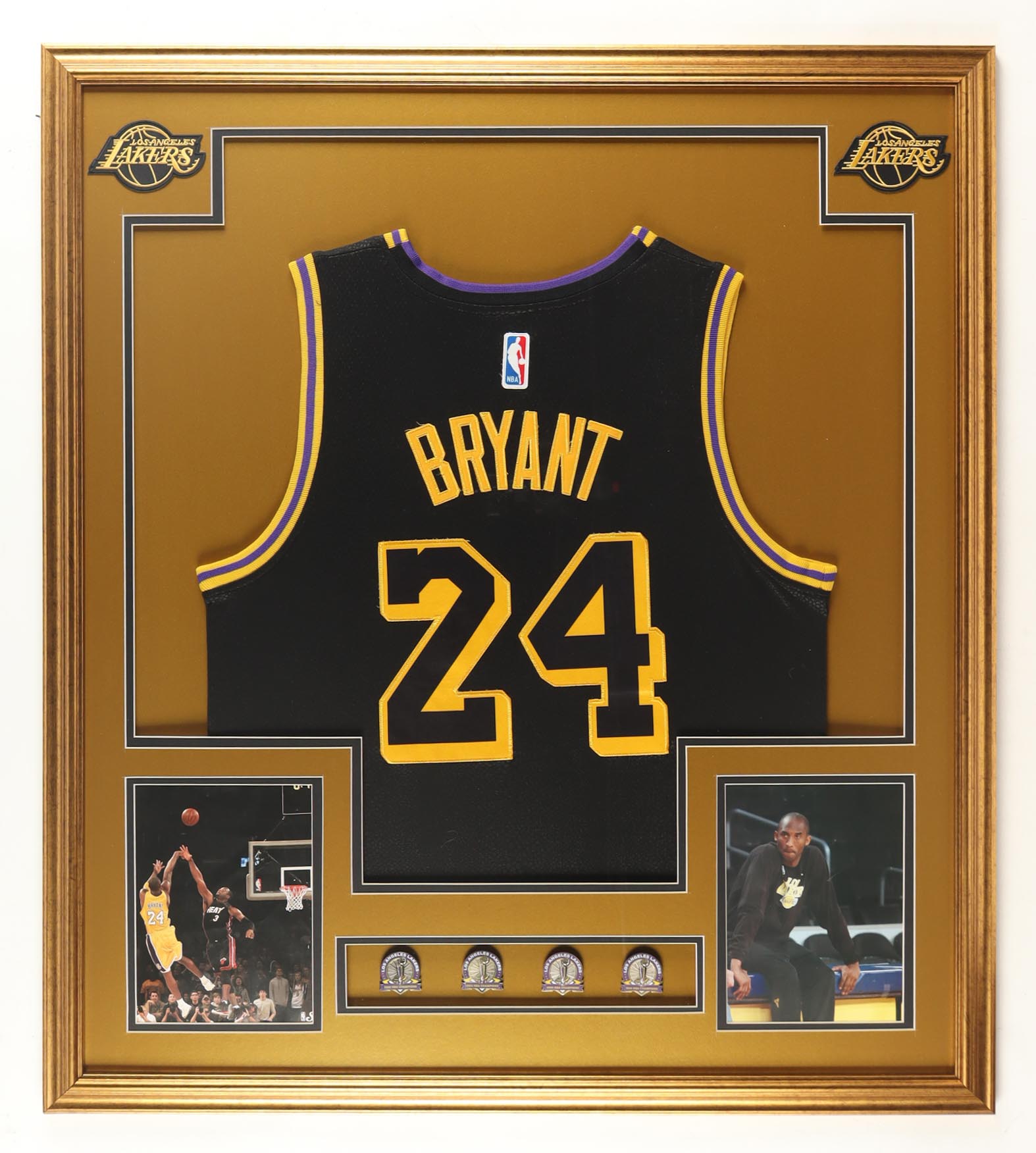 Custom frame measures approximately 32" x 36" in size and features an unsigned Kobe Bryant (D. 2020, HOF) Jersey. The display also includes (2) 8" x 10" Photos, (2) Team Logo Patches and (4) Championship pins. Please note, the display is unsigned.