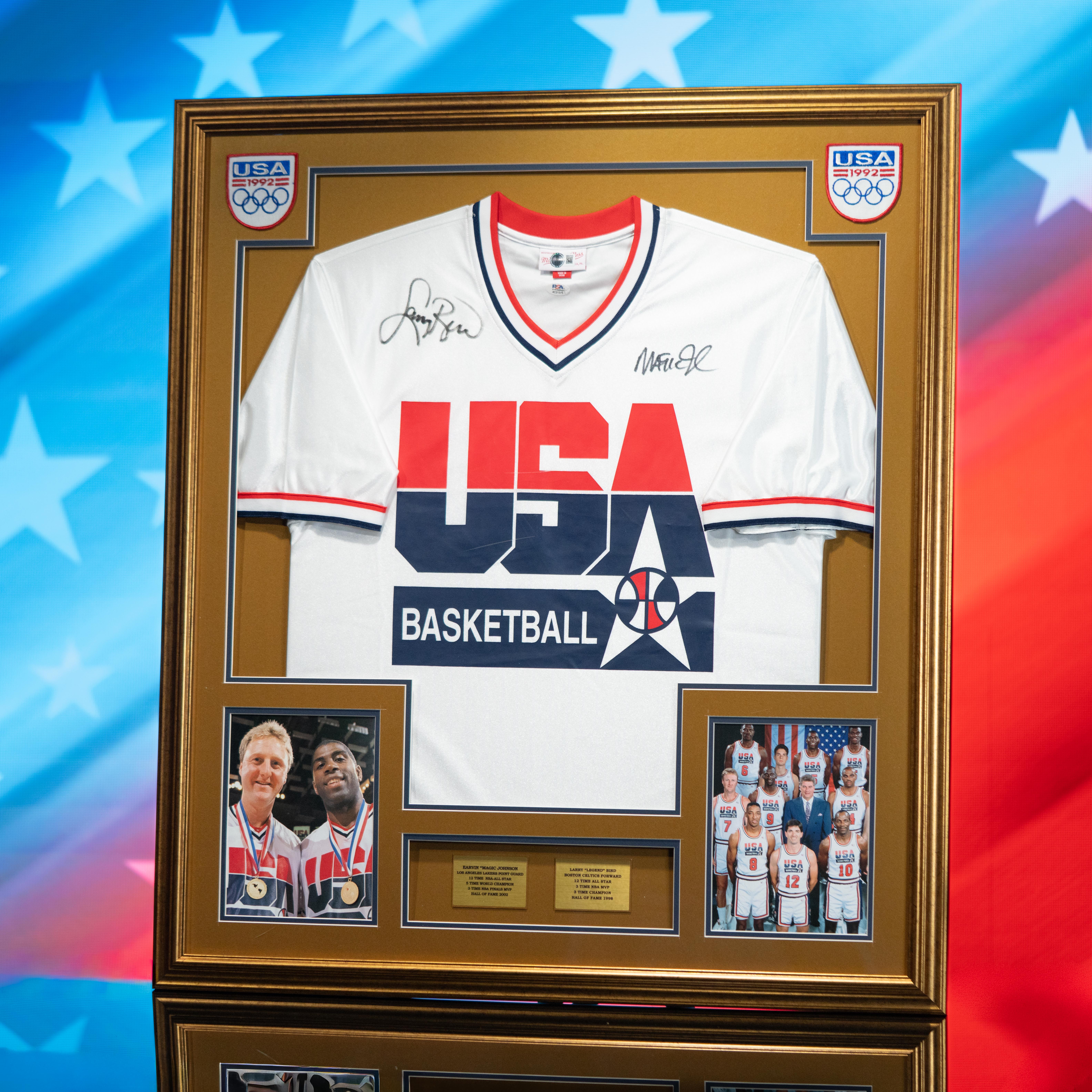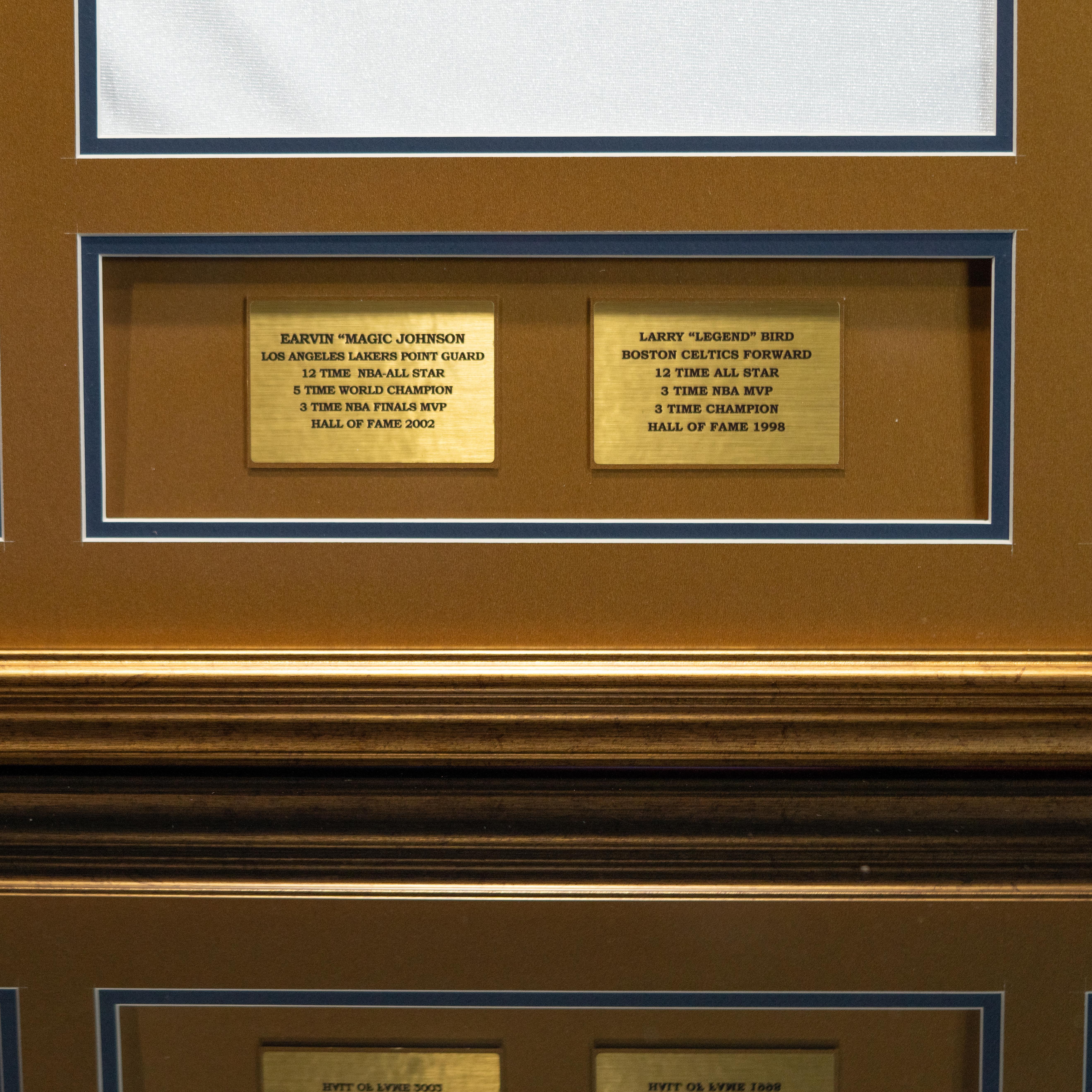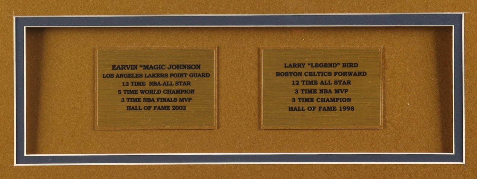 Custom frame measures 33" x 37" in size and features a warm up top that has been hand-signed by Larry Bird (Boston Celtics, HOF) and Magic Johnson (Los Angeles Lakers, HOF). Display also included (2) 8" x 10" photos as well as (2) career statistics plaques.