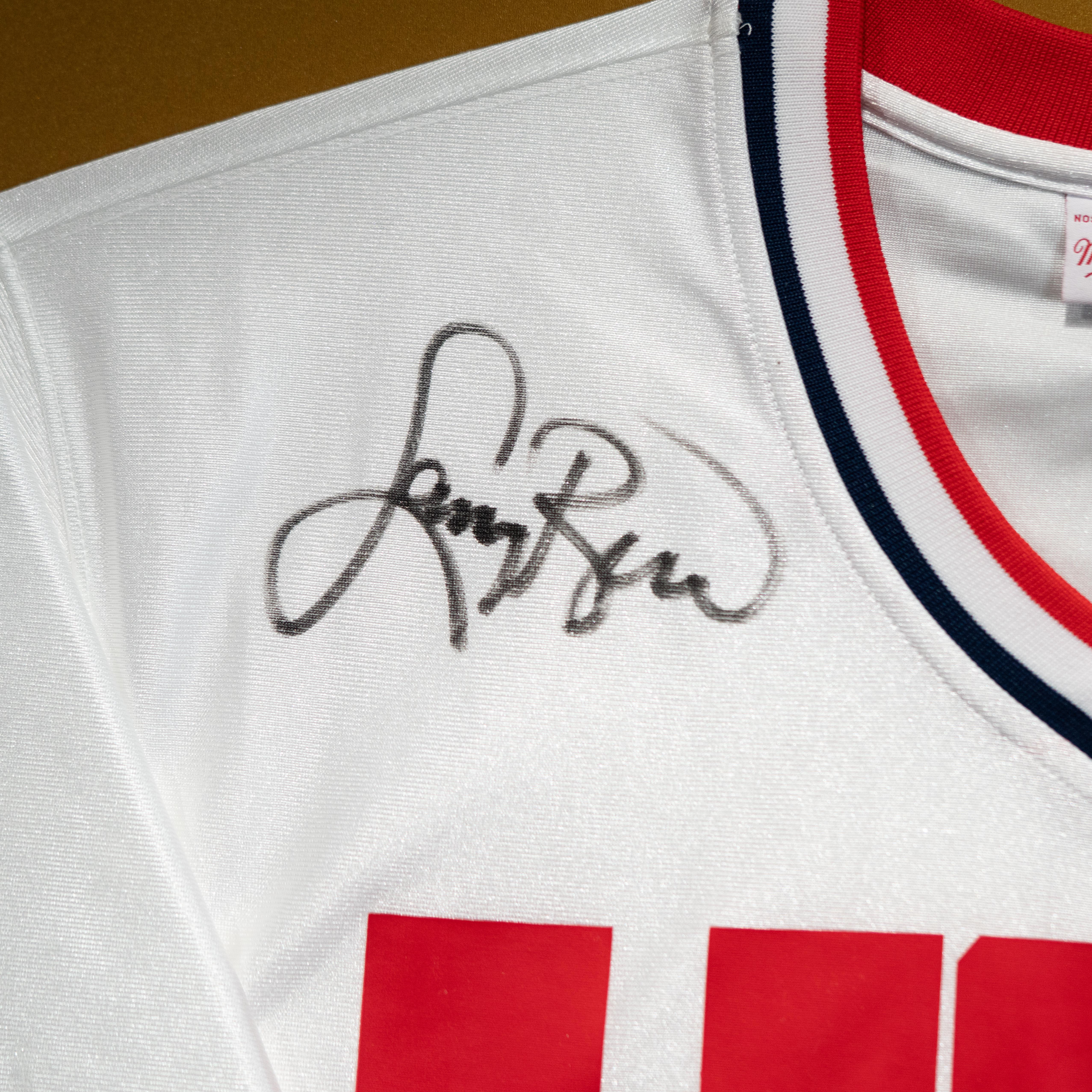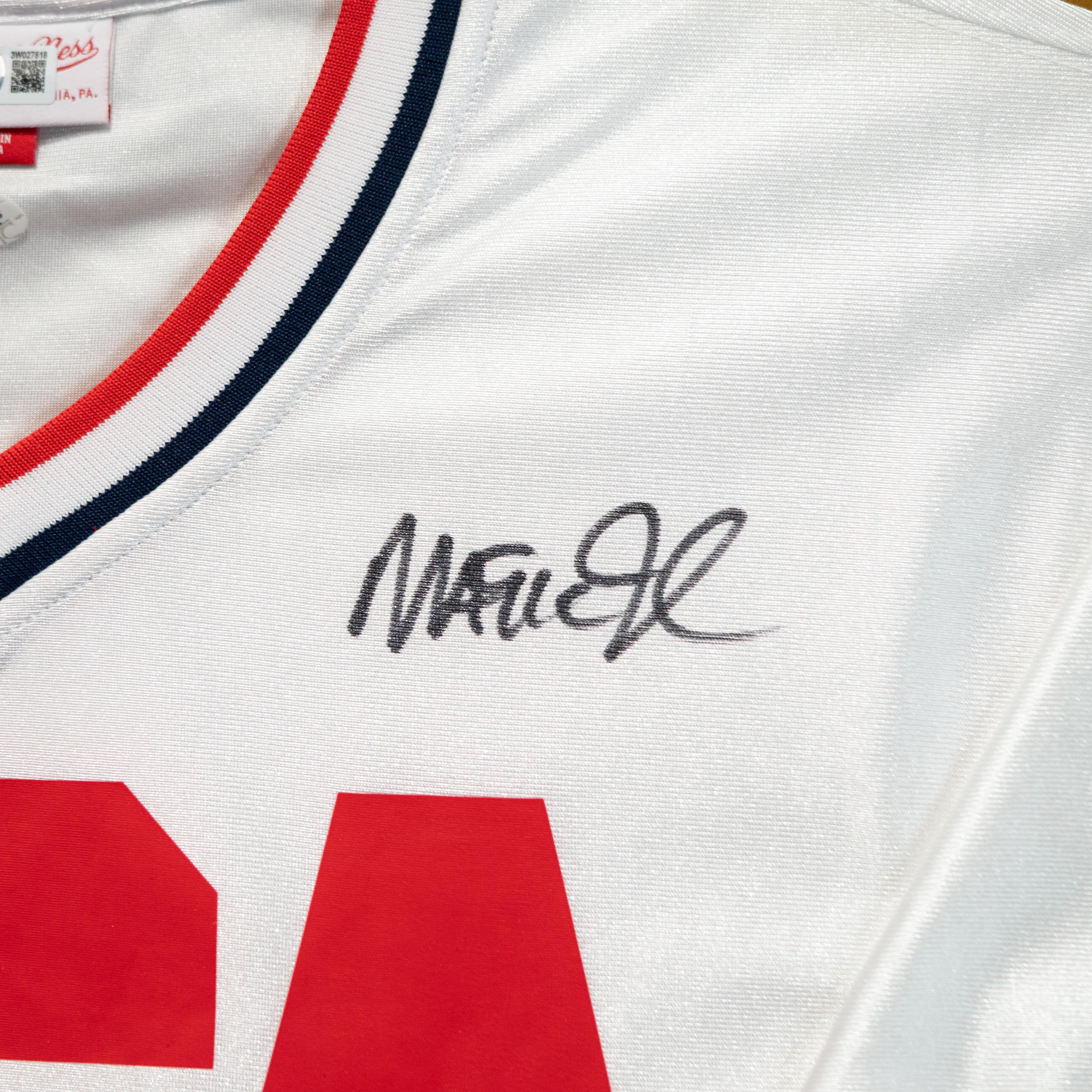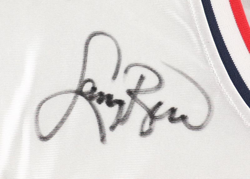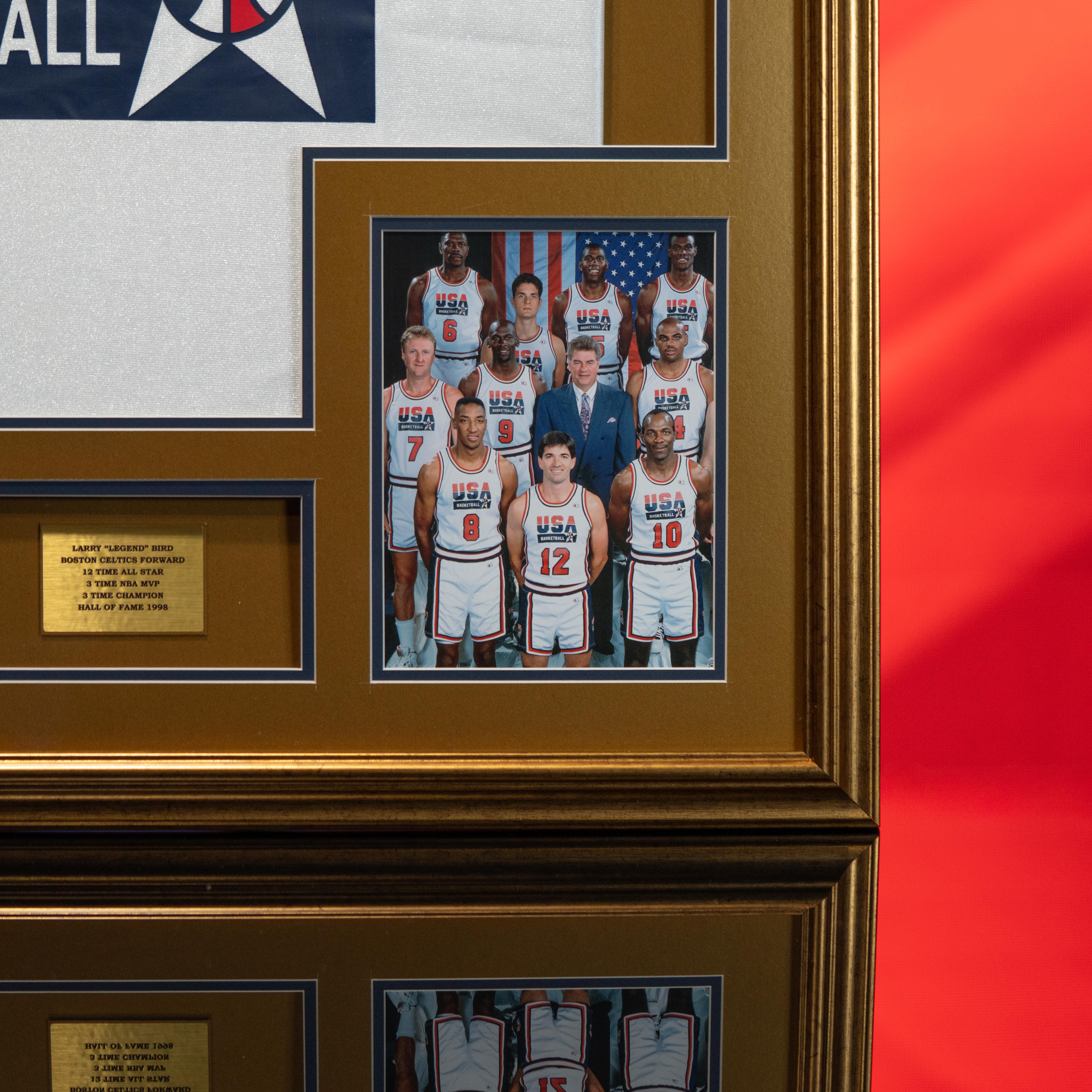 Custom frame measures 33" x 37" in size and features a warm up top that has been hand-signed by Larry Bird (Boston Celtics, HOF) and Magic Johnson (Los Angeles Lakers, HOF). Display also included (2) 8" x 10" photos as well as (2) career statistics plaques.