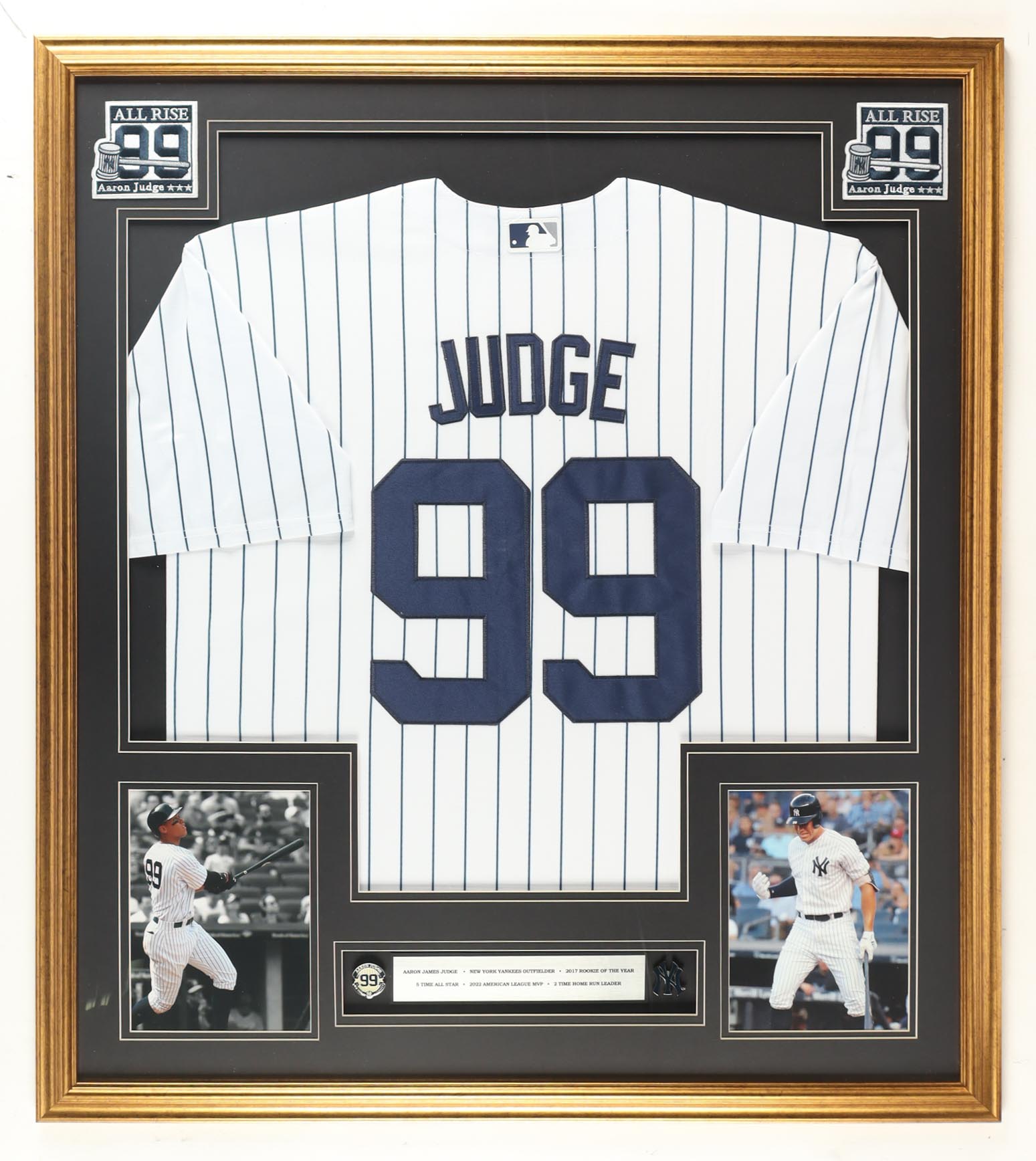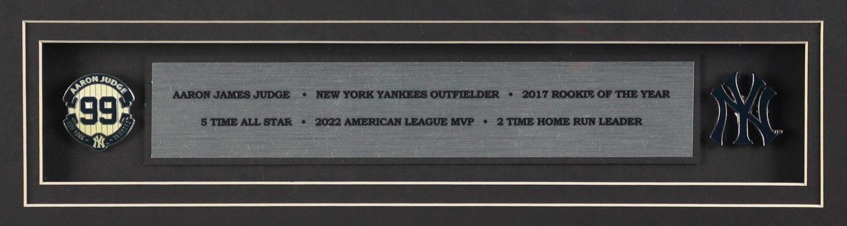 Custom frame measures approximately 32" x 36" in size and features an unsigned Aaron Judge jersey. The display also includes a career statistics plaque, (2) 8" x 10" Photos, (2) All Rise Logo Patches and (2) Judge pins. Please note, the display is unsigned.