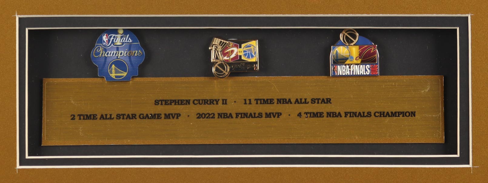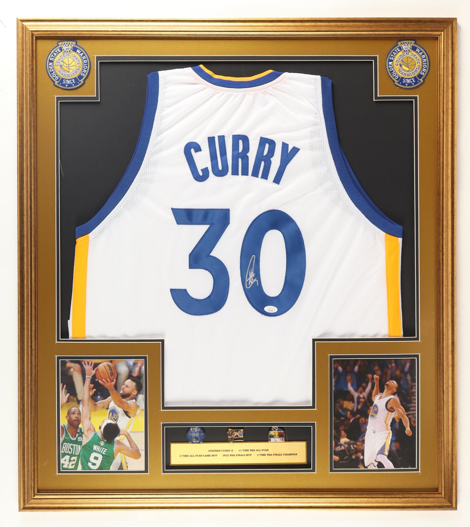 Custom frame display measures approximately 32" x 36" in size and features a jersey that has been hand-signed by Stephen Curry. The display also includes a career stat plaque, (2) 8" x 10" photos and (2) cloth team logo patches and (3) Championship pins.