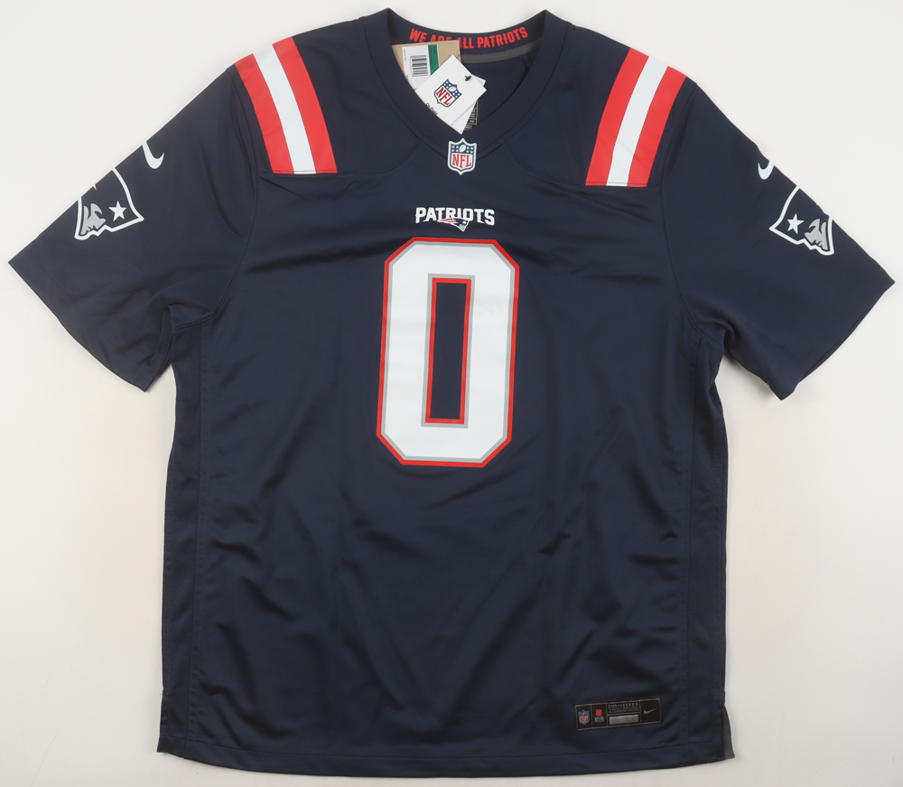 Nike jersey with everything pressed on, size XL. Hand-signed by Christian Gonzalez (New England Patriots).
