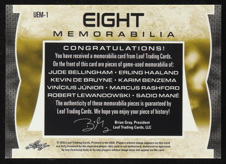 Jude Bellingham / Erling Haaland / Kevin De Bruyne / Karim Benzema / Vinicius Junior / Marcus Rashford / Robert Lewandowski / Sadio Mane 2022 Leaf Ultimate Eight Memorabilia Platinum Spectrum #UEM-1 #15/20