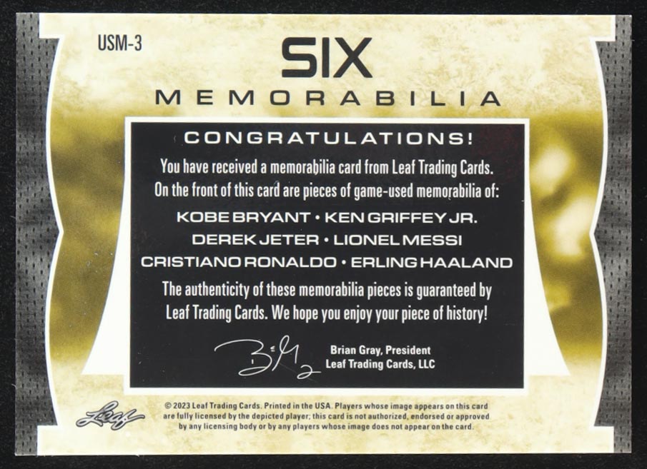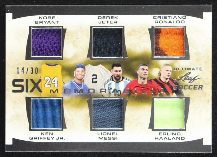 Kobe Bryant/Ken Griffey Jr./Derek Jeter/Lionel Messi/Cristiano Ronaldo/Erling Haaland 2022 Leaf Ultimate Six Memorabilia #USM-3 #14/30