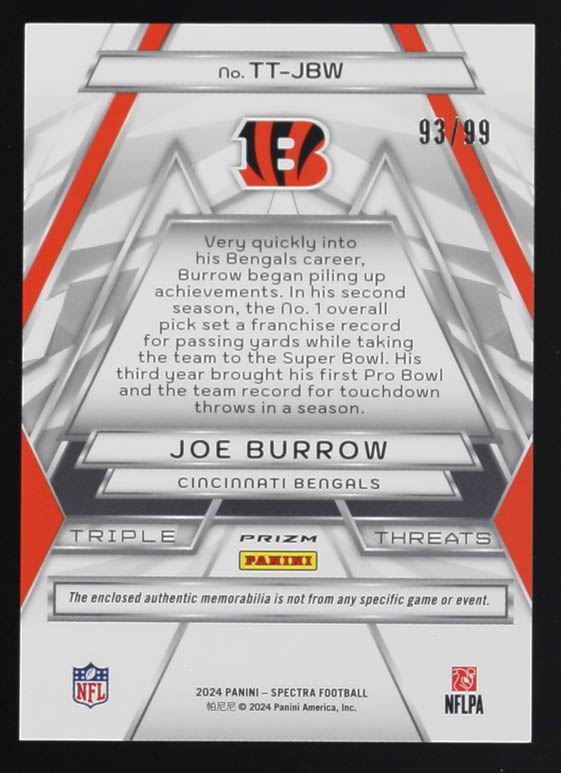 Joe Burrow 2024 Panini Spectra Triple Threats Materials #2 #93/99