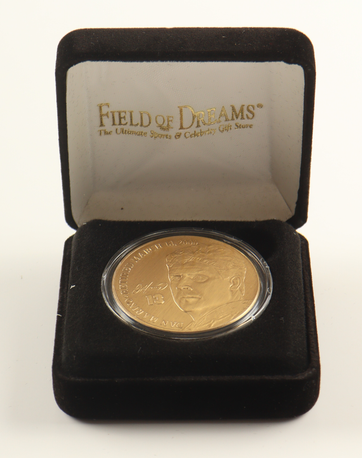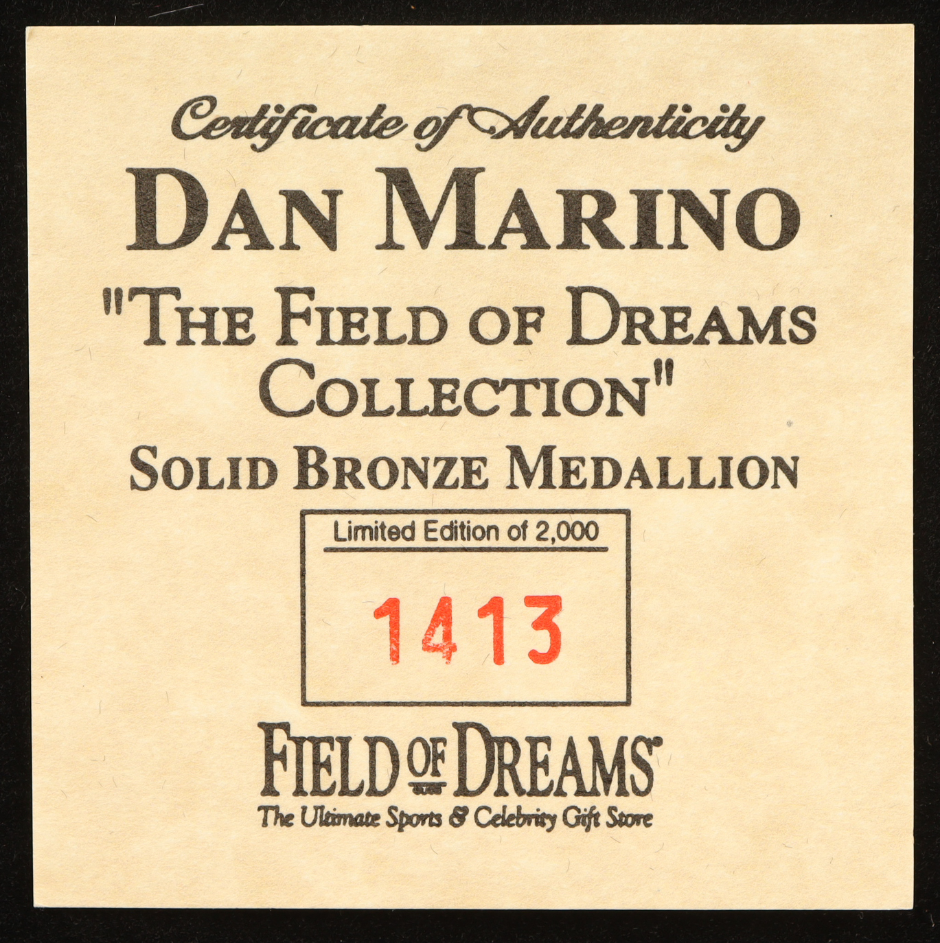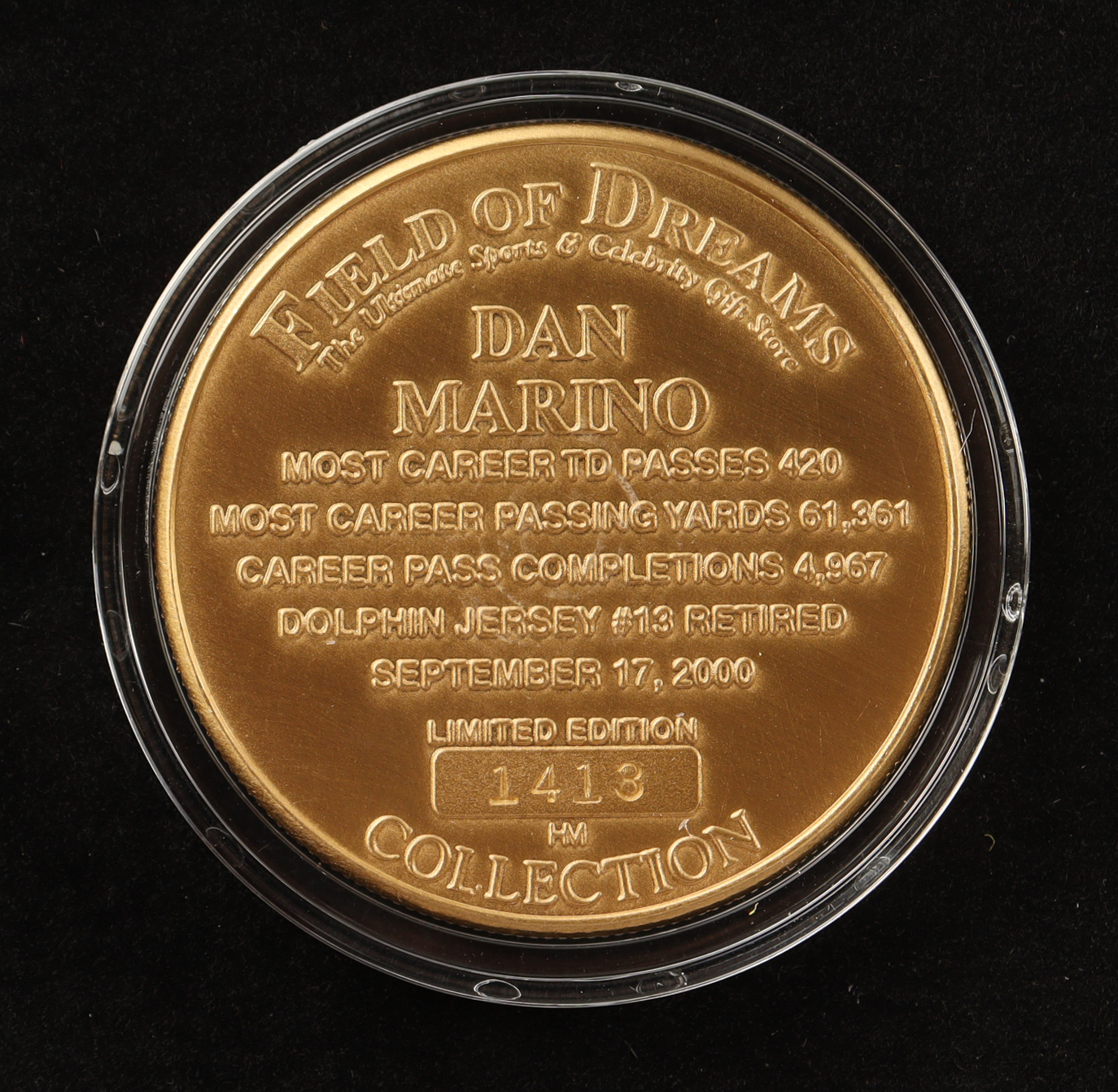 The Field of Dreams Collection Dan Marino (Miami Dolphins, HOF) Highland Mint bronze coin. The coin is limited edition, numbered #1,413 / 2,000.