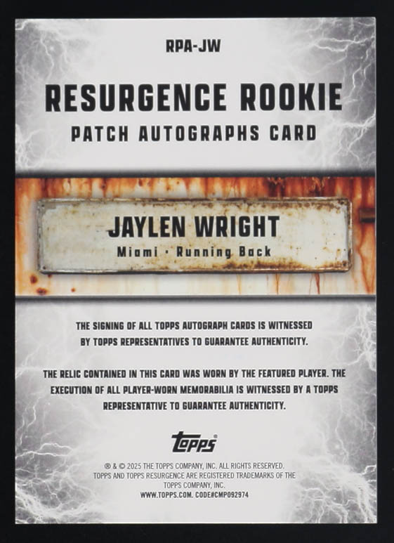 Jaylen Wright 2024 Topps Resurgence Resurgence Rookie Patch Autographs Electron #RPAJW #01/14 RC
