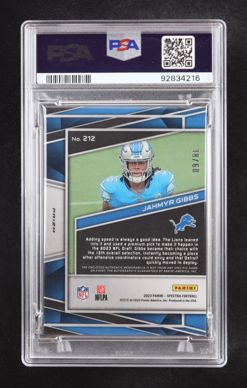 Jahmyr Gibbs 2023 Panini Spectra Hyper #212 Jersey Autograph #38/60 RC (PSA 8 | Auto 10)