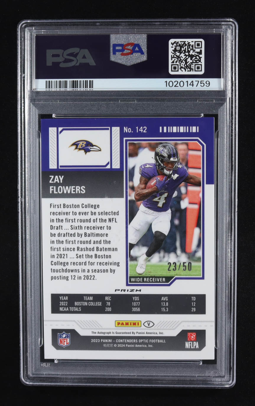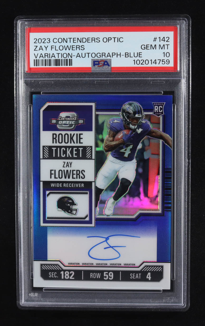 Zay Flowers 2023 Panini Contenders Optic Rookie Ticket Variation Autographs Blue #142 RC #23/50 (PSA 10)
