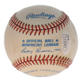 Rawlings Official American League baseball. Hand-signed by Brooks Robinson (D. 2023, Baltimore Orioles, HOF). Please note, the baseball is stained and naturally toned.