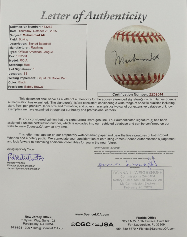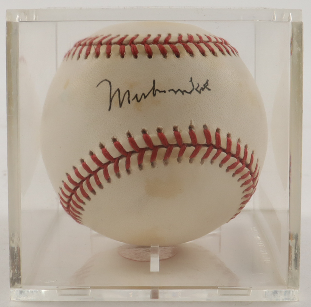 Rawlings Official American League Baseball. Hand-signed by Muhammad Ali (HOF). Please note that the display case is included in the listing as shown.