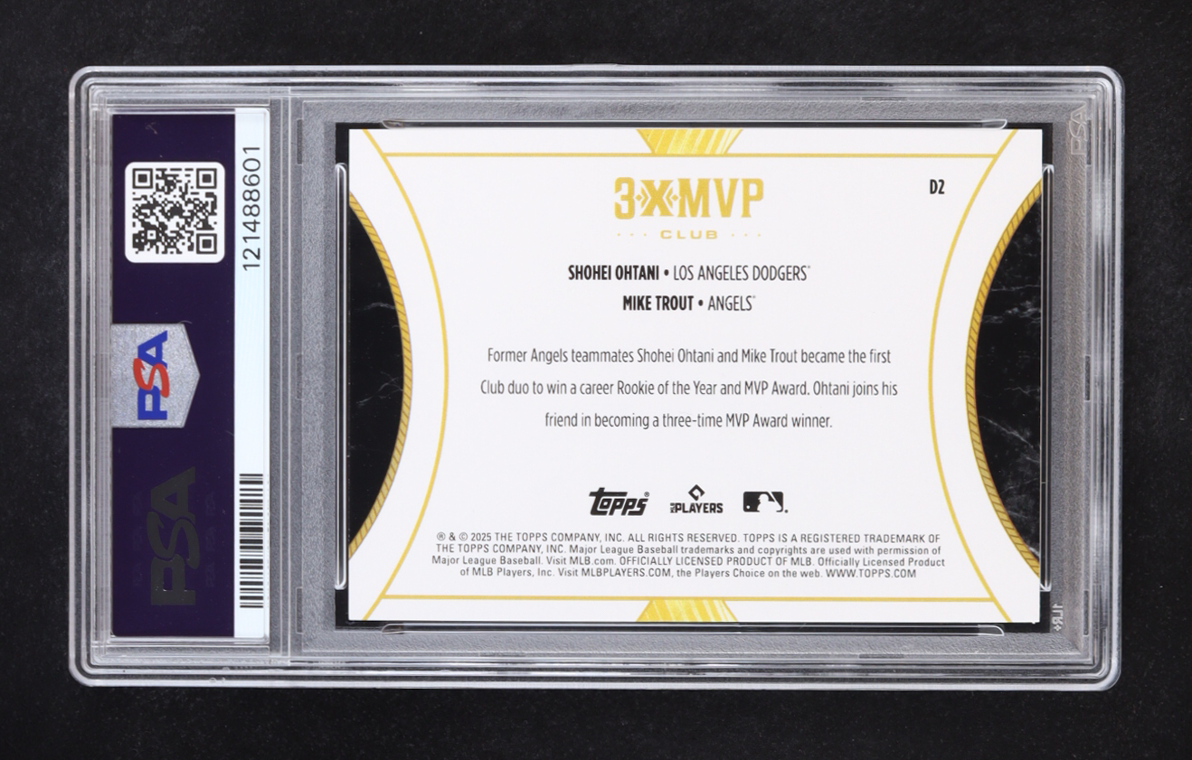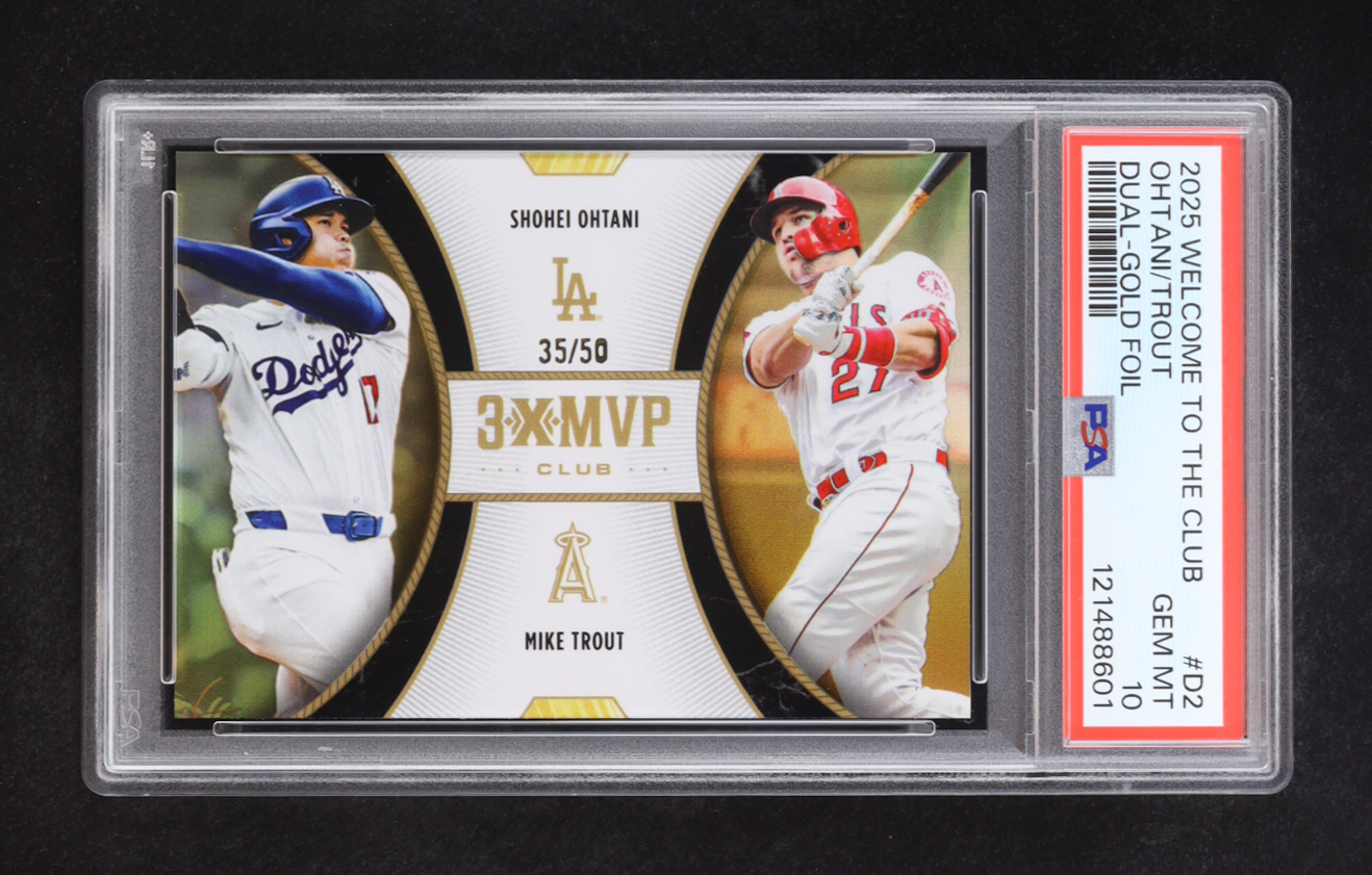 Shohei Ohtani / Mike Trout 2025 Topps Welcome to the Club 3X MVP Dual 3X MVP Gold Starburst Foil #D2 #35/50 (PSA 10)