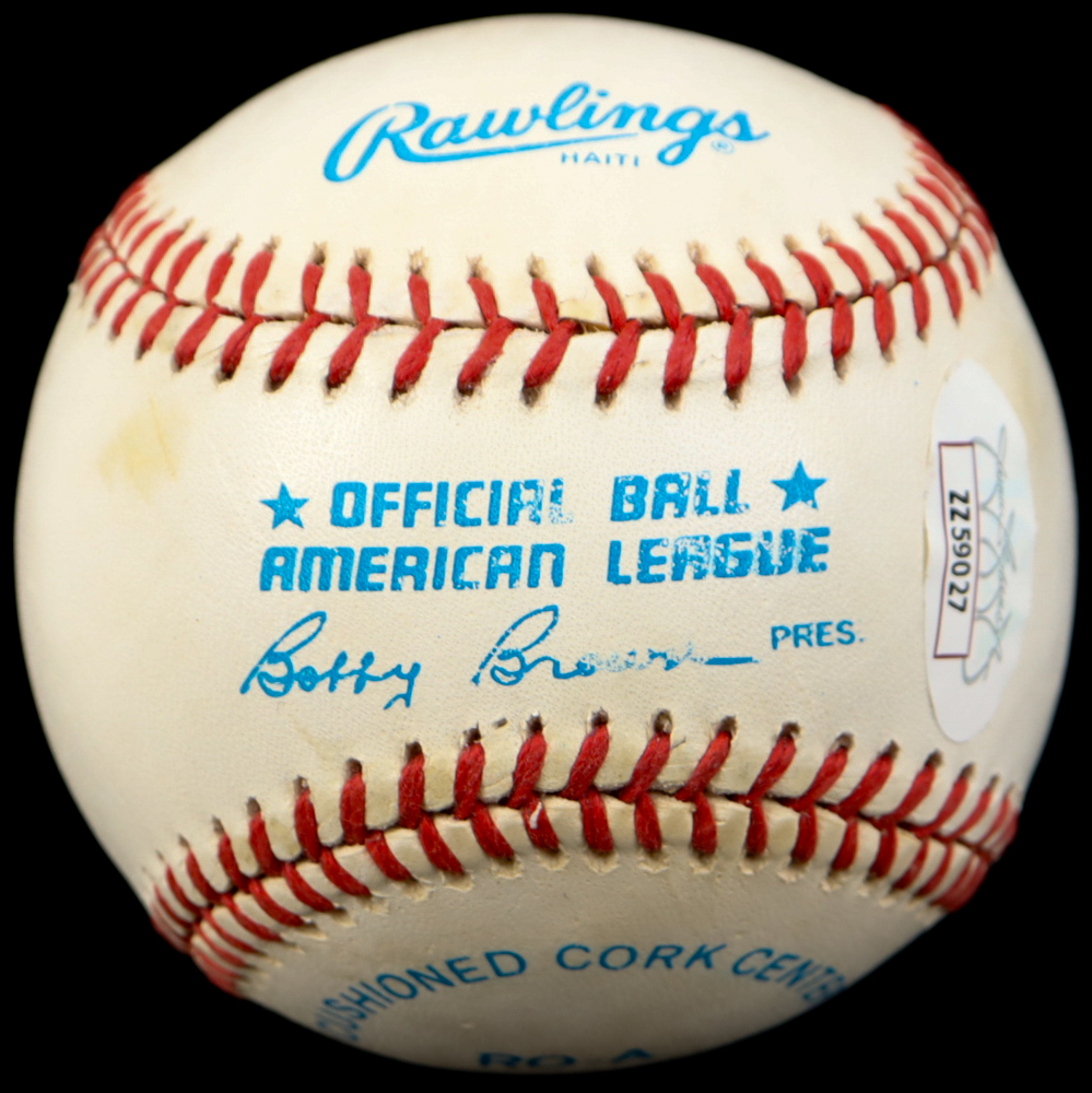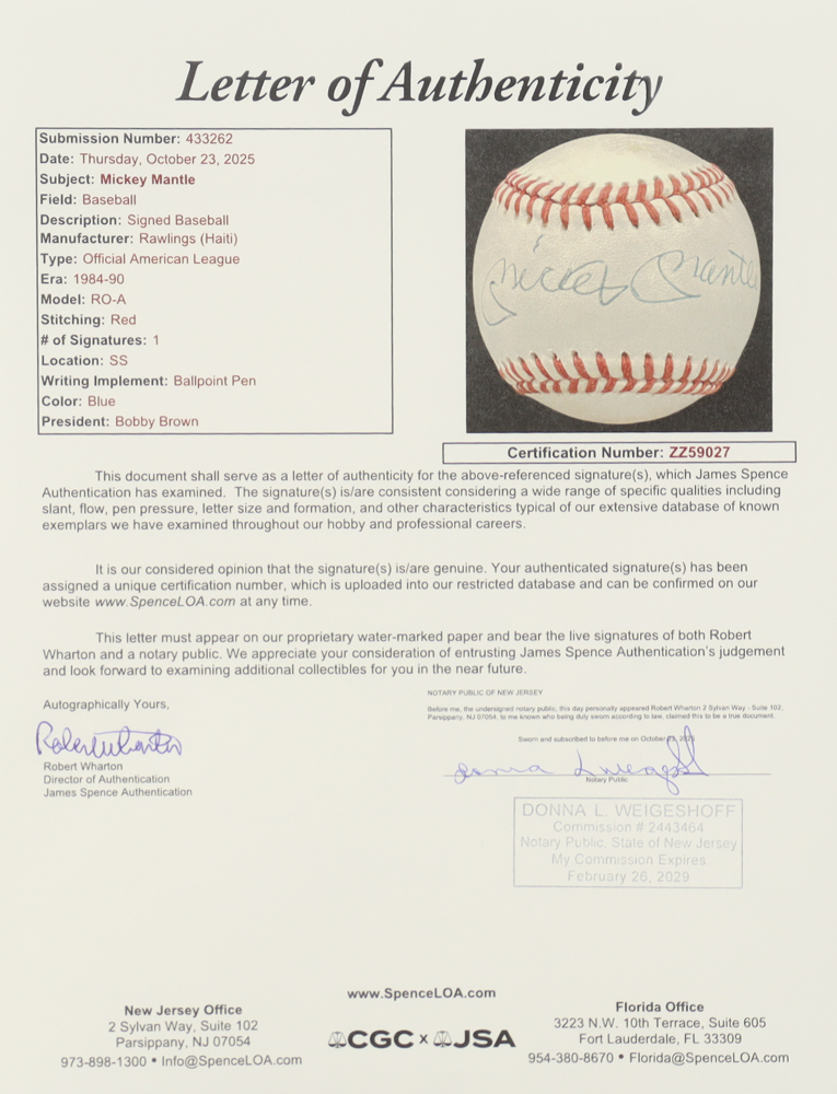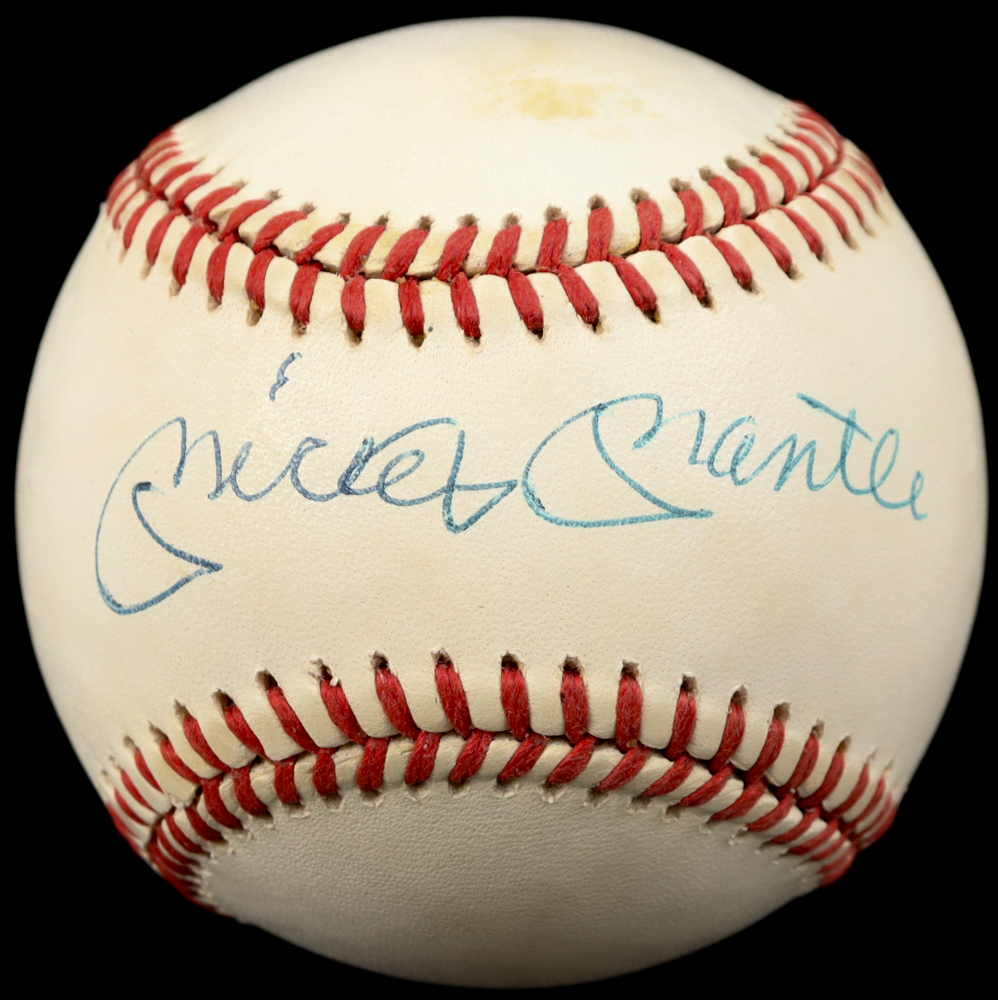 Rawlings Official American League baseball has been hand-signed by Mickey Mantle (D. 1995, New York Yankees, HOF).