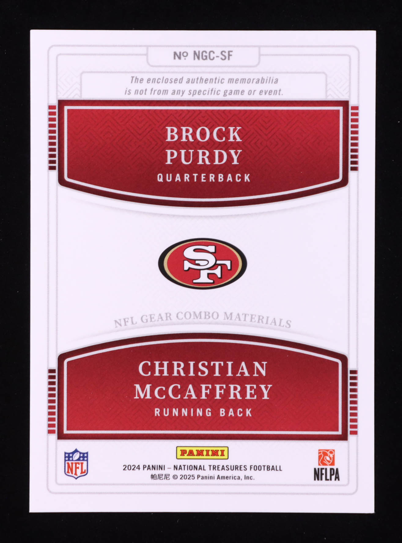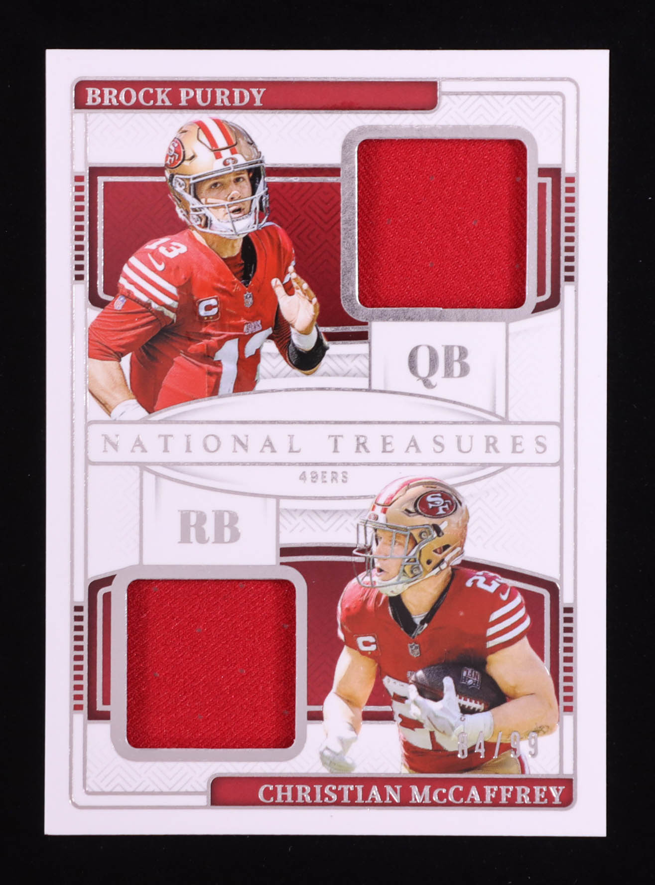 Brock Purdy / Christian McCaffrey 2024 Panini National Treasures NFL Gear Combo Materials #27 #84/99