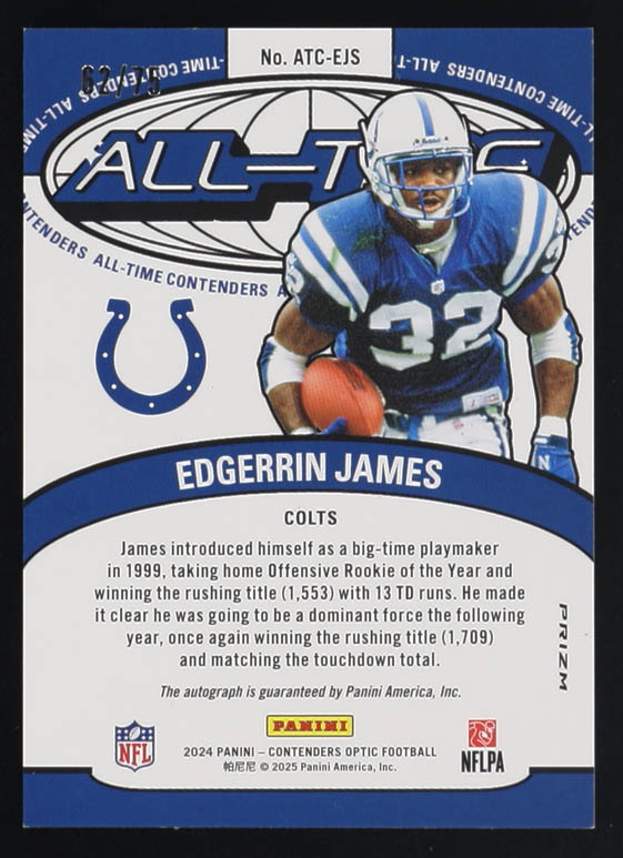 Edgerrin James 2024 Panini Contenders Optic All Time Contenders Autographs #1 #62/75