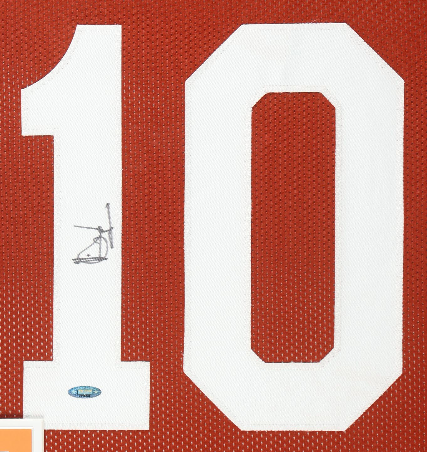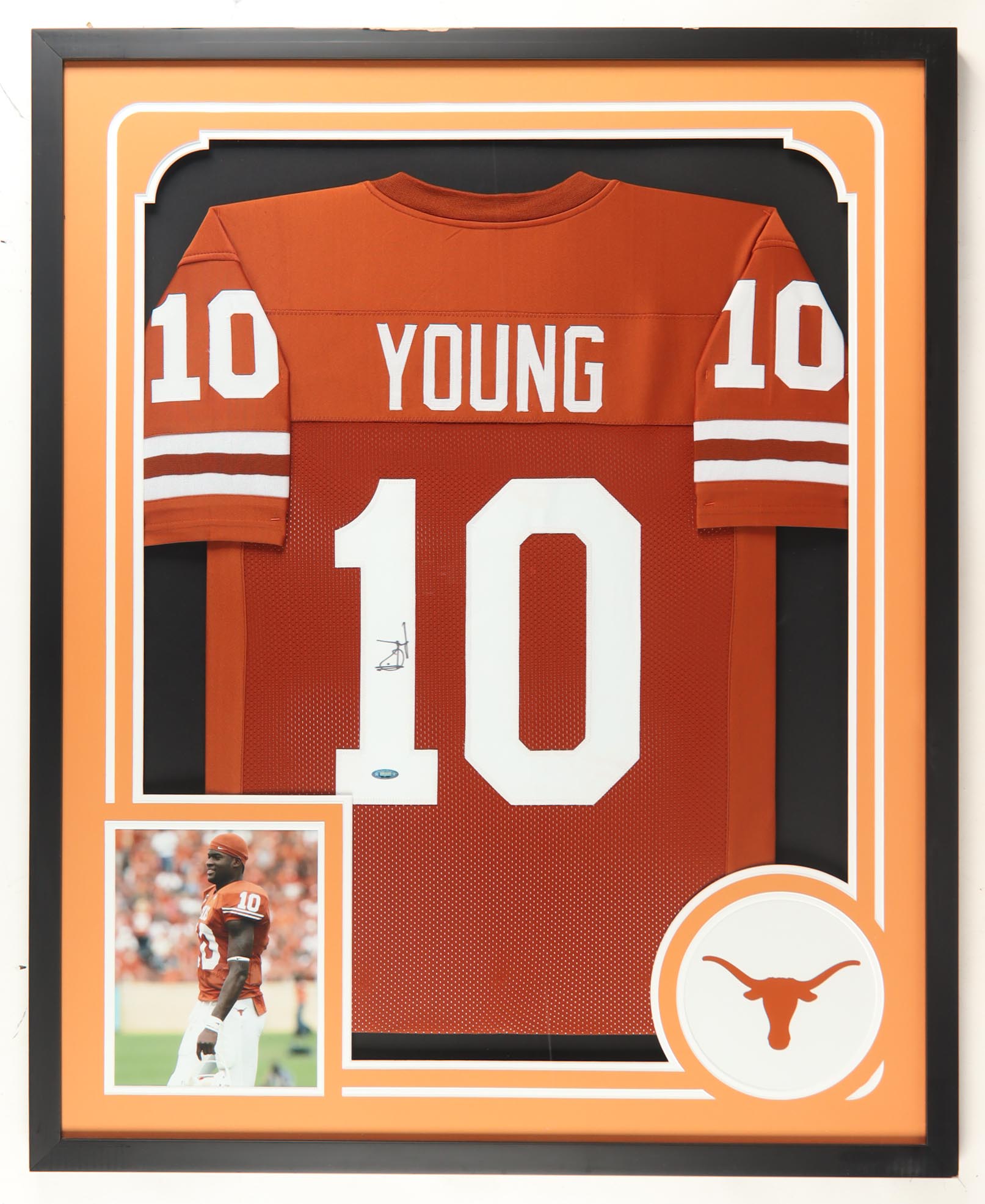 Custom frame measures approximately 34" x 42" in size and features a jersey that has been hand-signed by Vince Young.