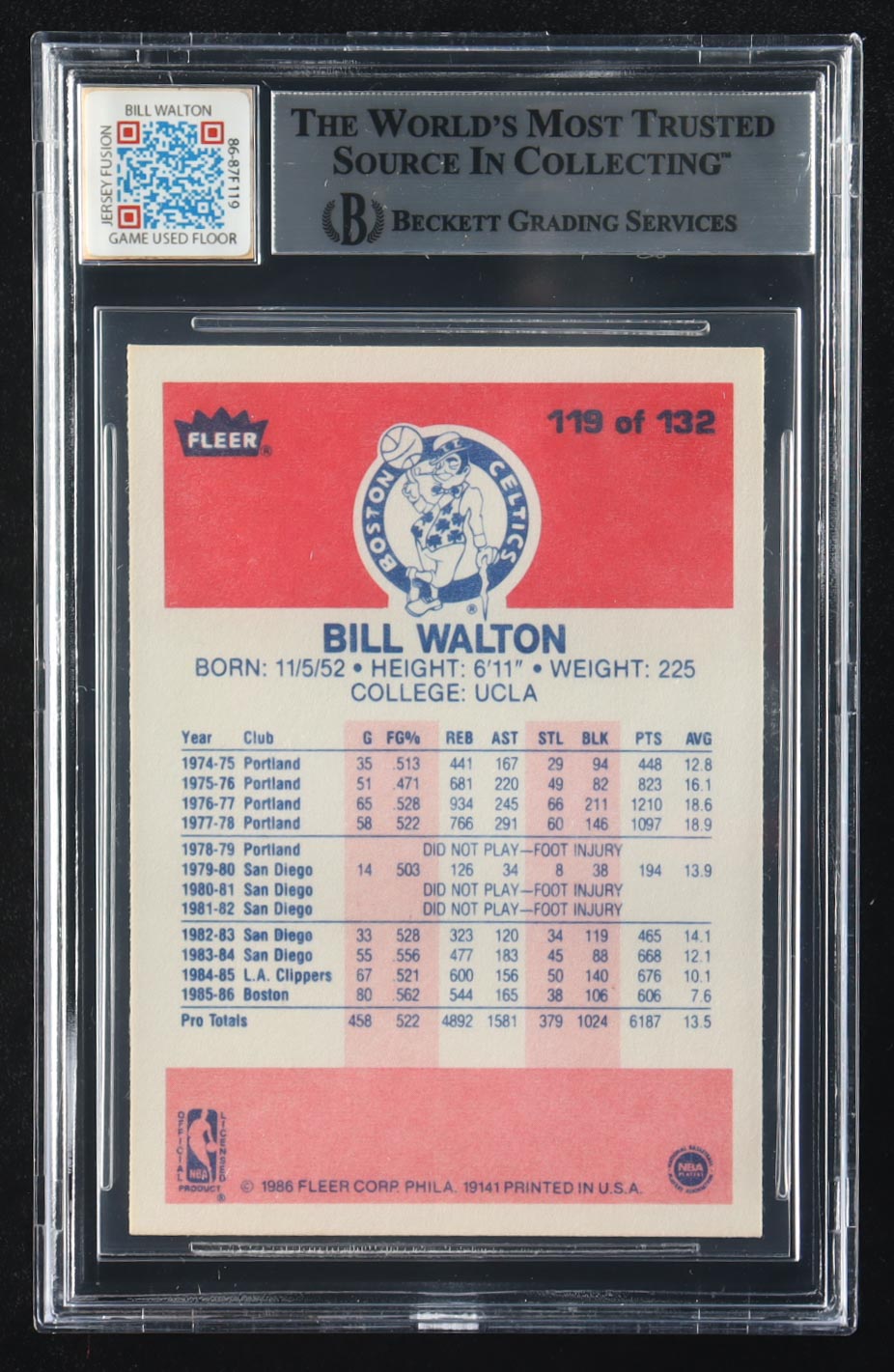 Bill Walton 1986-87 Fleer #119 UER with Jersey Fusion Game-Used Floor Piece (BGS 8)
