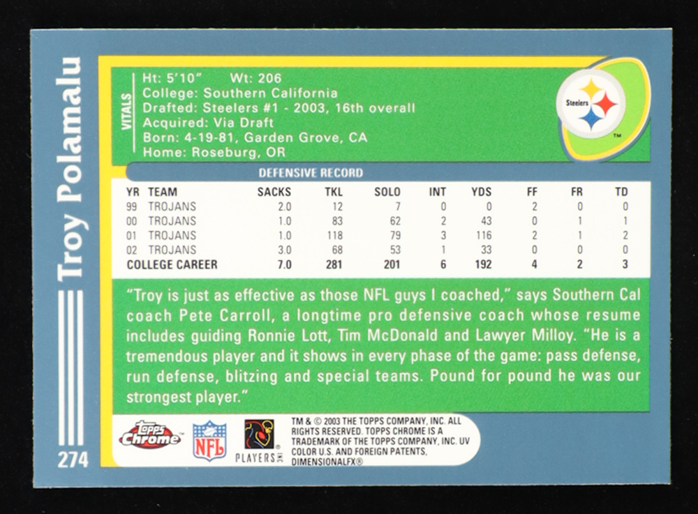 Troy Polamalu 2003 Topps Chrome #274 RC