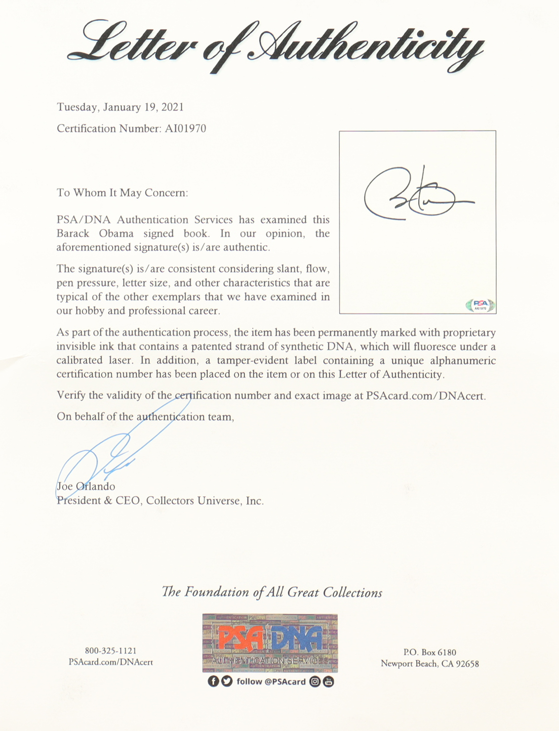 Hardcover book has been hand-signed on the inside tittle page by Barack Obama (44th President Of The United States). Book also includes hardcover sleeve as shown