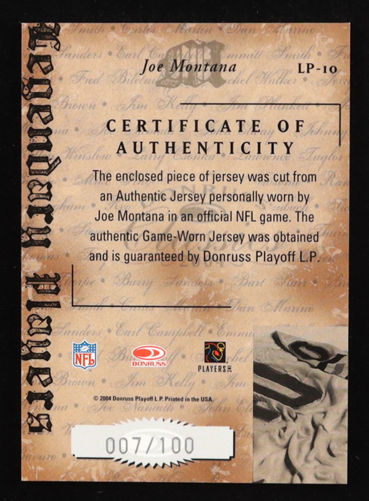 Joe Montana 2004 Donruss Classics Legendary Players Jerseys #LP10 #007/100