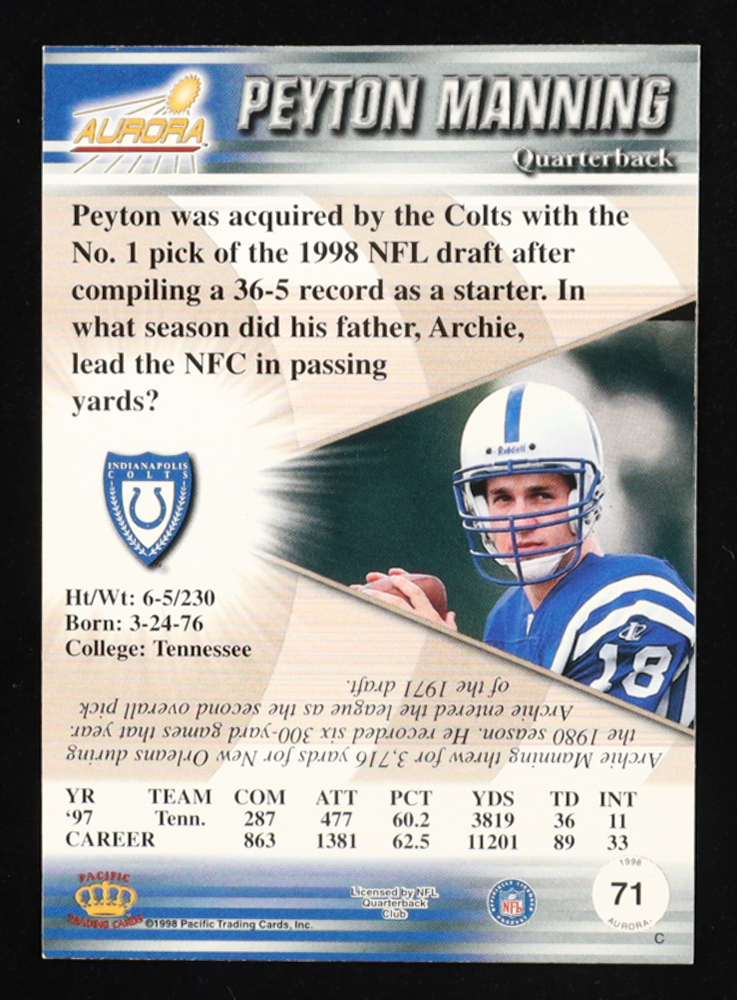 Peyton Manning 1998 Aurora #71 RC