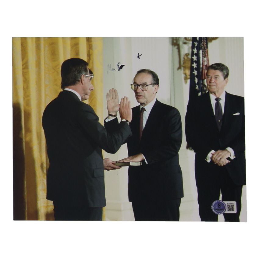 Photo measures 8" x 10" in size. Hand-signed by Alan Greenspan. Please note, the signature is faint and smudged.