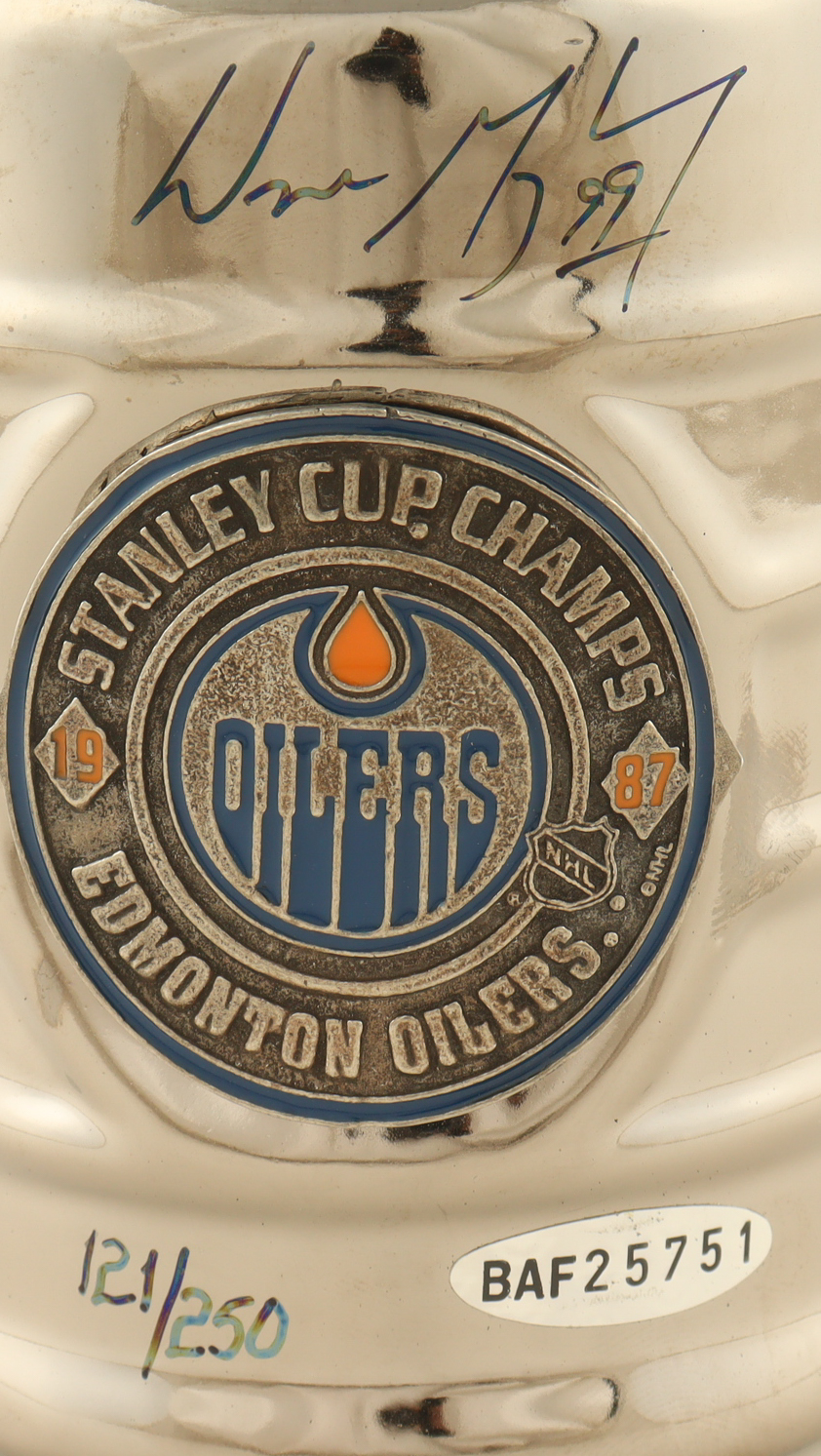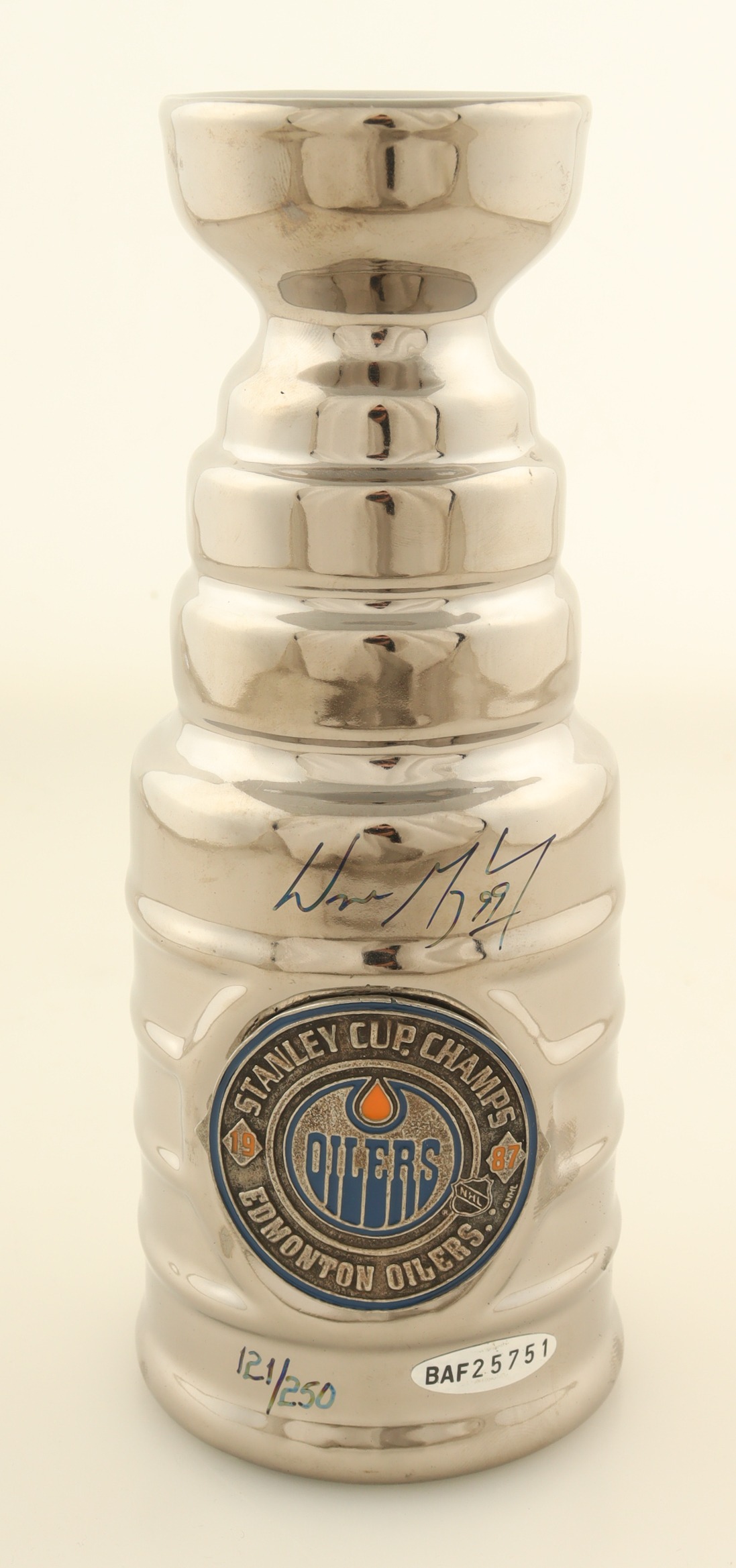 1987 Edmonton Oilers Stanley Cup Champions Mini Trophy measures approximately 8" in height and has been hand-signed by Wayne Gretzky (Edmonton Oilers, HOF). There mini trophy is limited edition and has been hand-numbered #121/250.