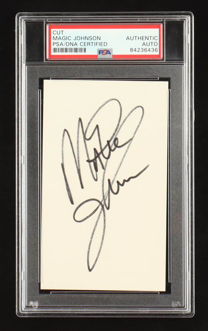 Cut measures approximately 3" x 5" in size has been hand-signed by Magic Johnson (Los Angeles Lakers, HOF).