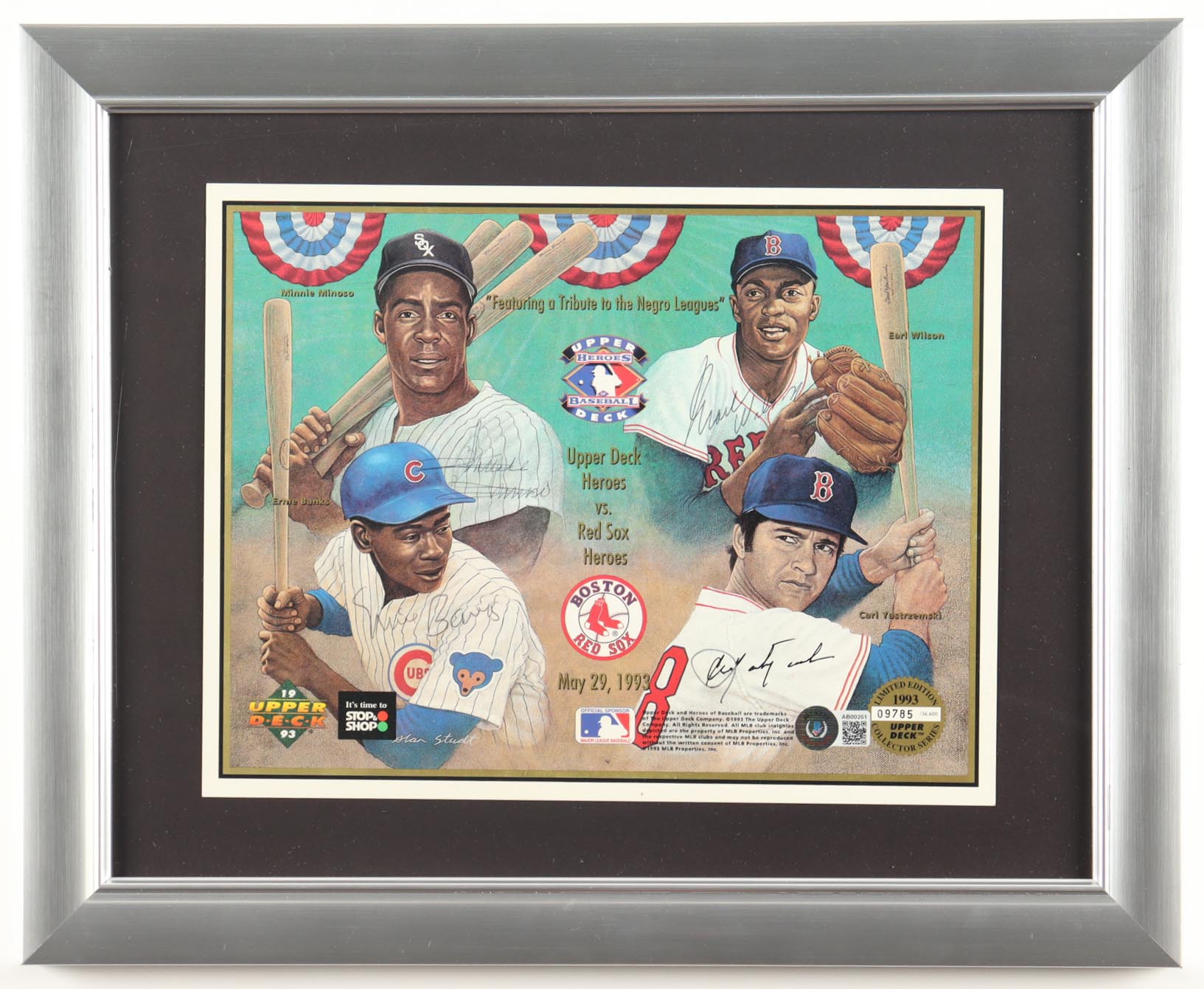 Upper Deck Heroes Custom Framed Photo Display Signed by (4) with Minnie Minoso, Ernie Banks, Earl Wilson, Carl Yastrzemski (Beckett)