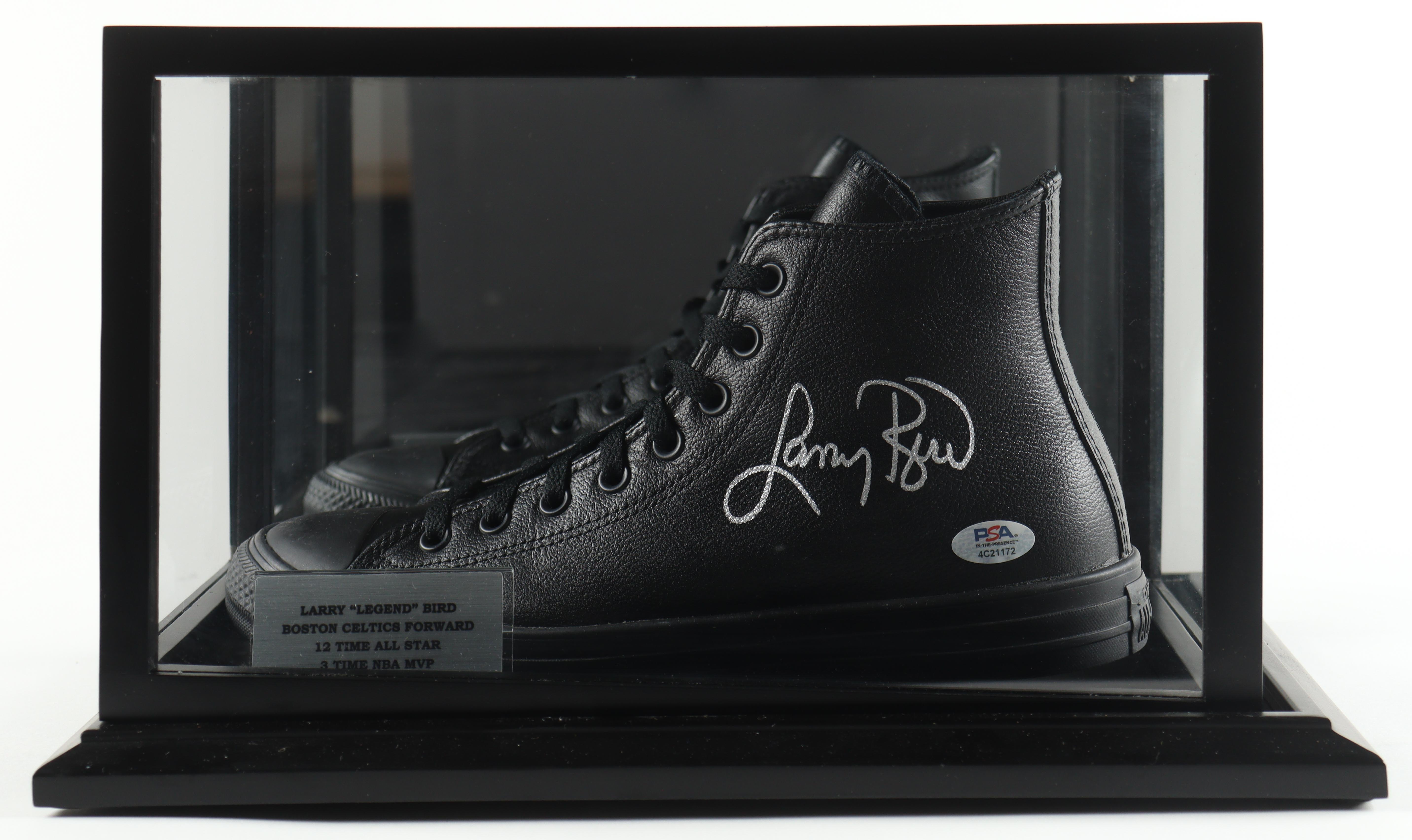 Larry Bird Signed Converse Basketball Shoe With Name Plaque Display Case (PSA)